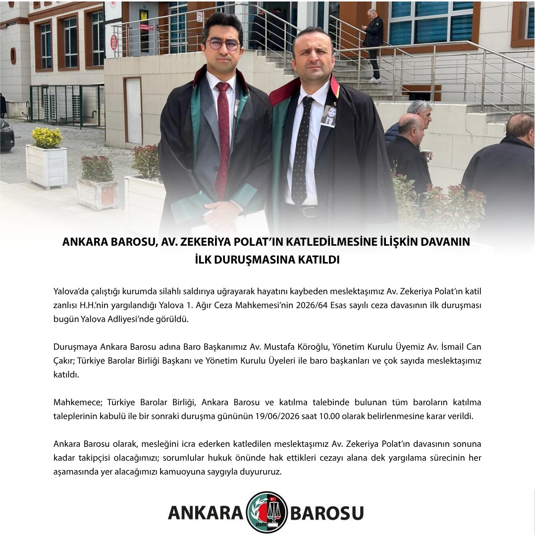 Ankara Barosu olarak, mesleğini icra ederken katledilen meslektaşımız Av. Zekeriya Polat’ın davasının sonuna kadar takipçisi olacağımızı; sorumlular hukuk önünde hak ettikleri cezayı alana dek yargılama sürecinin her aşamasında yer alacağımızı kamuoyuna saygıyla duyururuz.