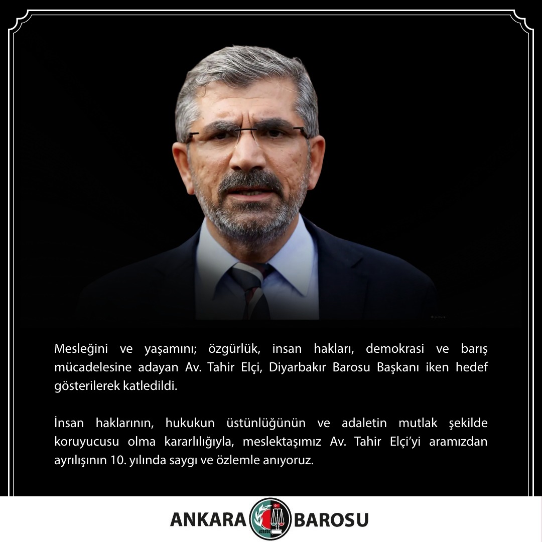 İnsan haklarının, hukukun üstünlüğünün ve adaletin mutlak şekilde koruyucusu olma kararlılığıyla, meslektaşımız Av. Tahir Elçi’yi aramızdan ayrılışının 10. yılında saygı ve özlemle anıyoruz.