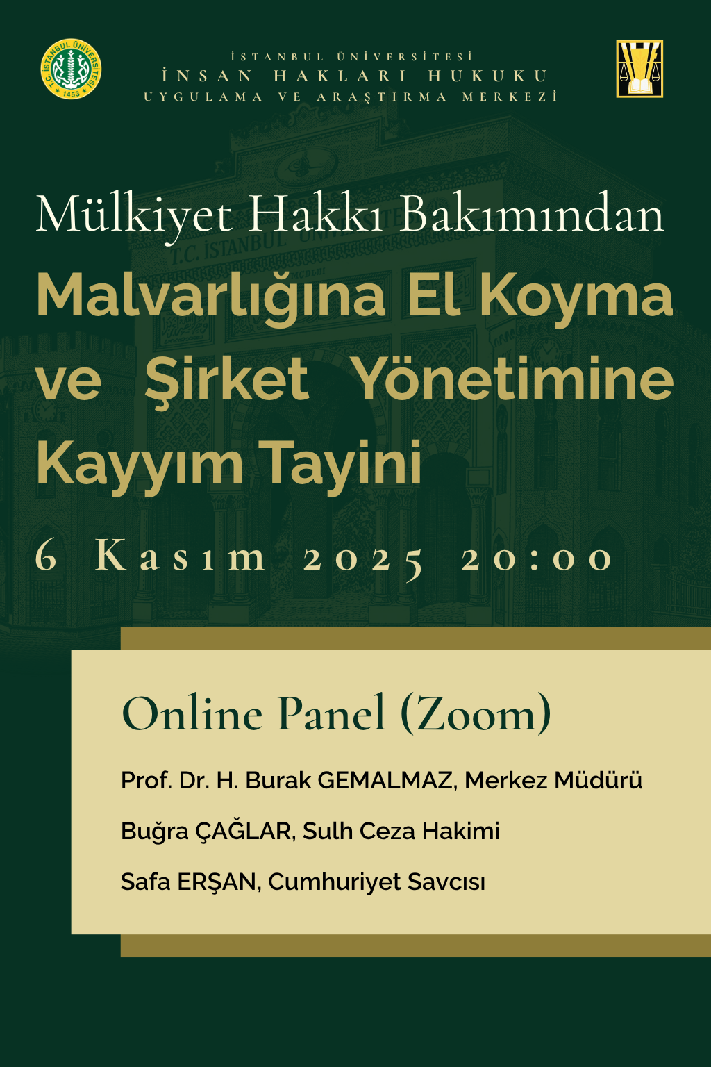 İstanbul Üniversitesi İnsan Hakları Uygulama ve Araştırma Merkezi bünyesinde 6 Kasım 2025 Perşembe Saat 20.00’de “Mülkiyet Hakkı Bakımından Malvarlığına El Koyma ve Şirket Yönetimine Kayyım Tayini” konulu çevrimiçi panel düzenlenecektir.