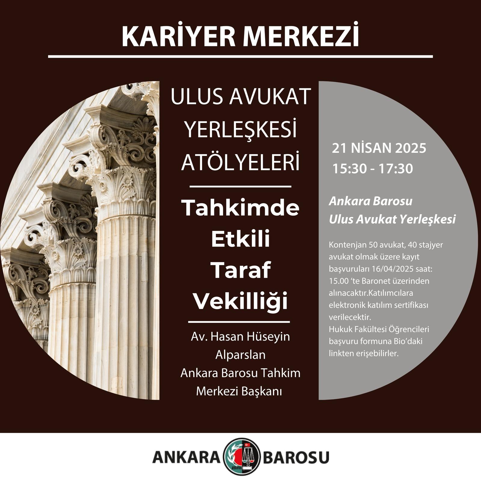 Kariyer Merkezi;" Ulus Avukat Yerleşke Atölye Serisi", 21 Nisan 2025 tarihinde, "Tahkimde Etkili Taraf Vekilliği" başlığıyla Av. Hasan Hüseyin ALPARSLAN tarafından gerçekleştirilecektir. Başvurular 16/04/2025 tarihinde saat 15.00'te Baronet üzerinden açılacaktır. Kontenjan 50 avukat ve 40 stajyer avukatla sınırlıdır.