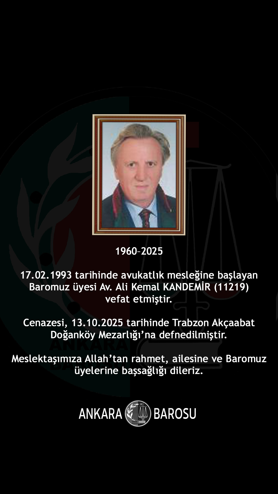 17.02.1993 tarihinde avukatlık mesleğine başlayan Baromuz üyesi Av. Ali Kemal KANDEMİR (11219) vefat etmiştir. Cenazesi, 13.10.2025 tarihinde Trabzon Akçaabat Doğanköy Mezarlığı’na defnedilmiştir. Meslektaşımıza Allah'tan rahmet, ailesine ve Baromuz üyelerine başsağlığı dileriz.