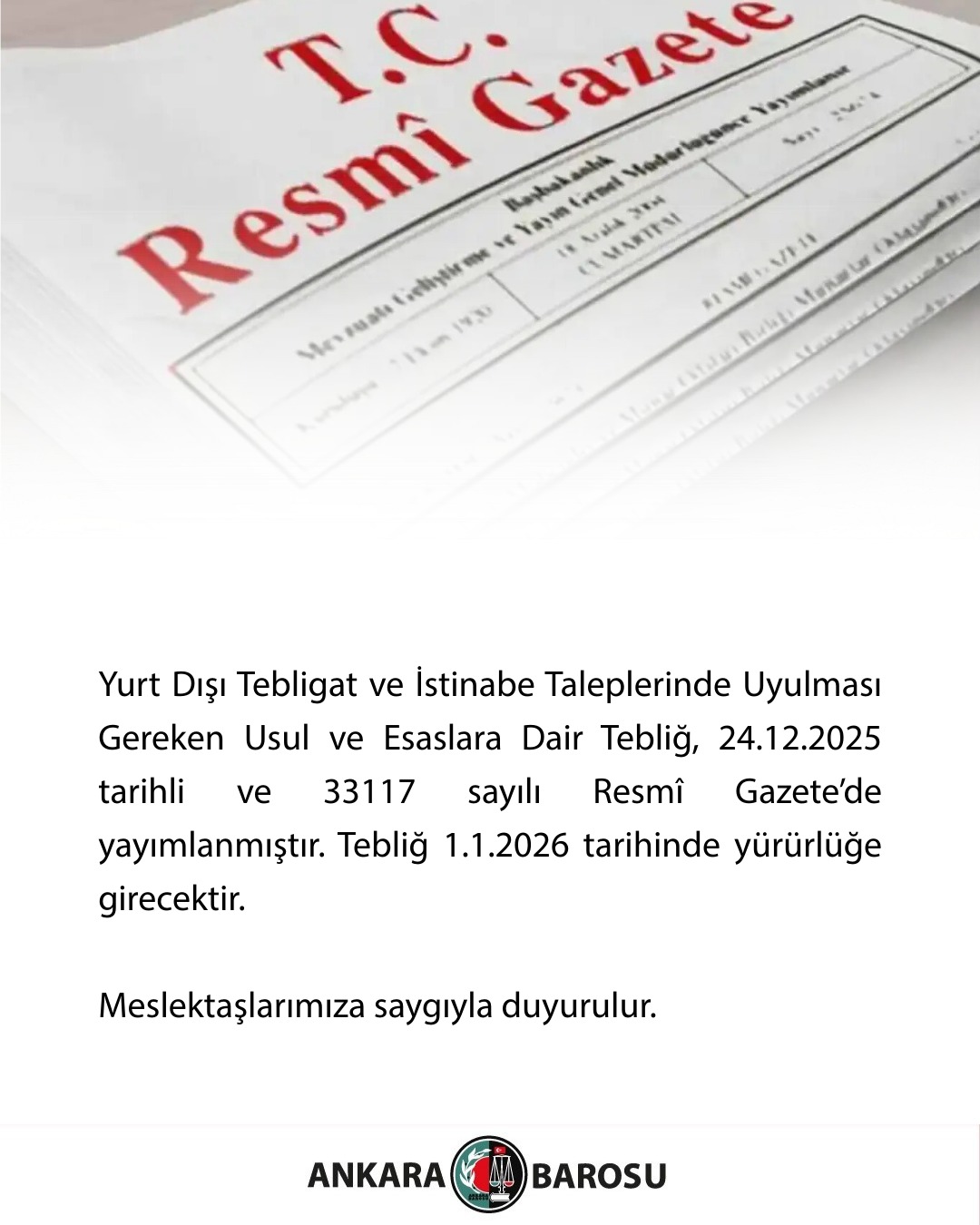 YURT DIŞI TEBLİGAT VE İSTİNABE TALEPLERİNDE UYULMASI GEREKEN USUL VE ESASLARA DAİR TEBLİĞ, 24.12.2025 TARİHLİ VE 33117 SAYILI RESMÎ GAZETE’DE YAYIMLANMIŞTIR. TEBLİĞ 1.1.2026 TARİHİNDE YÜRÜRLÜĞE GİRECEKTİR.