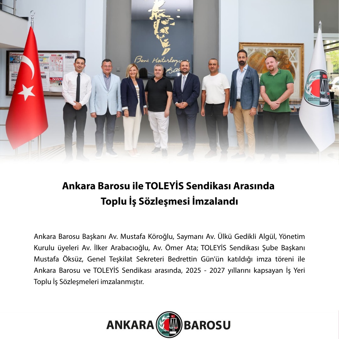 Ankara Barosu Başkanı Av. Mustafa Köroğlu, Saymanı Av. Ülkü Gedikli Algül, Yönetim Kurulu üyeleri Av. İlker Arabacıoğlu, Av. Ömer Ata; TOLEYİS Sendikası Şube Başkanı Mustafa Öksüz, Genel Teşkilat Sekreteri Bedrettin Gün’ün katıldığı imza töreni ile Ankara Barosu ve TOLEYİS Sendikası arasında, 2025 - 2027 yıllarını kapsayan İş Yeri Toplu İş Sözleşmeleri imzalanmıştır.
