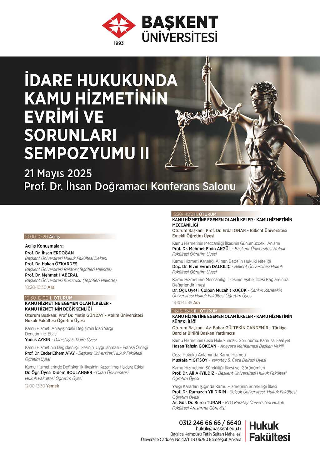 Başkent Üniversitesi Hukuk Fakültesi tarafından 21 Mayıs 2025 Çarşamba günü düzenlenecek olan “İdare Hukukunda Kamu Hizmetinin Evrimi ve Sorunları Sempozyumu II”
