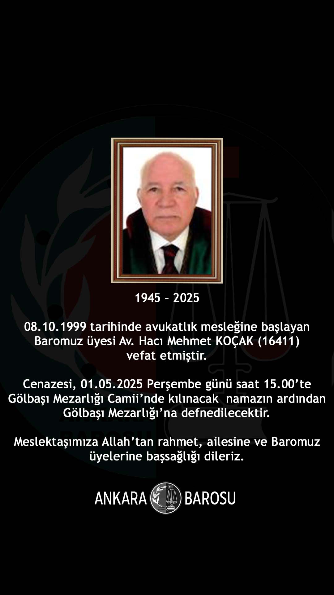 08.10.1999 tarihinde avukatlık mesleğine başlayan Baromuz üyesi Av. Hacı Mehmet KOÇAK (16411) vefat etmiştir. Cenazesi, 01.05.2025 Perşembe günü saat 15.00’te Gölbaşı Mezarlığı Camii’nde kılınacak namazın ardından Gölbaşı Mezarlığı’na defnedilecektir. Meslektaşımıza Allah'tan rahmet, ailesine ve Baromuz üyelerine başsağlığı dileriz.