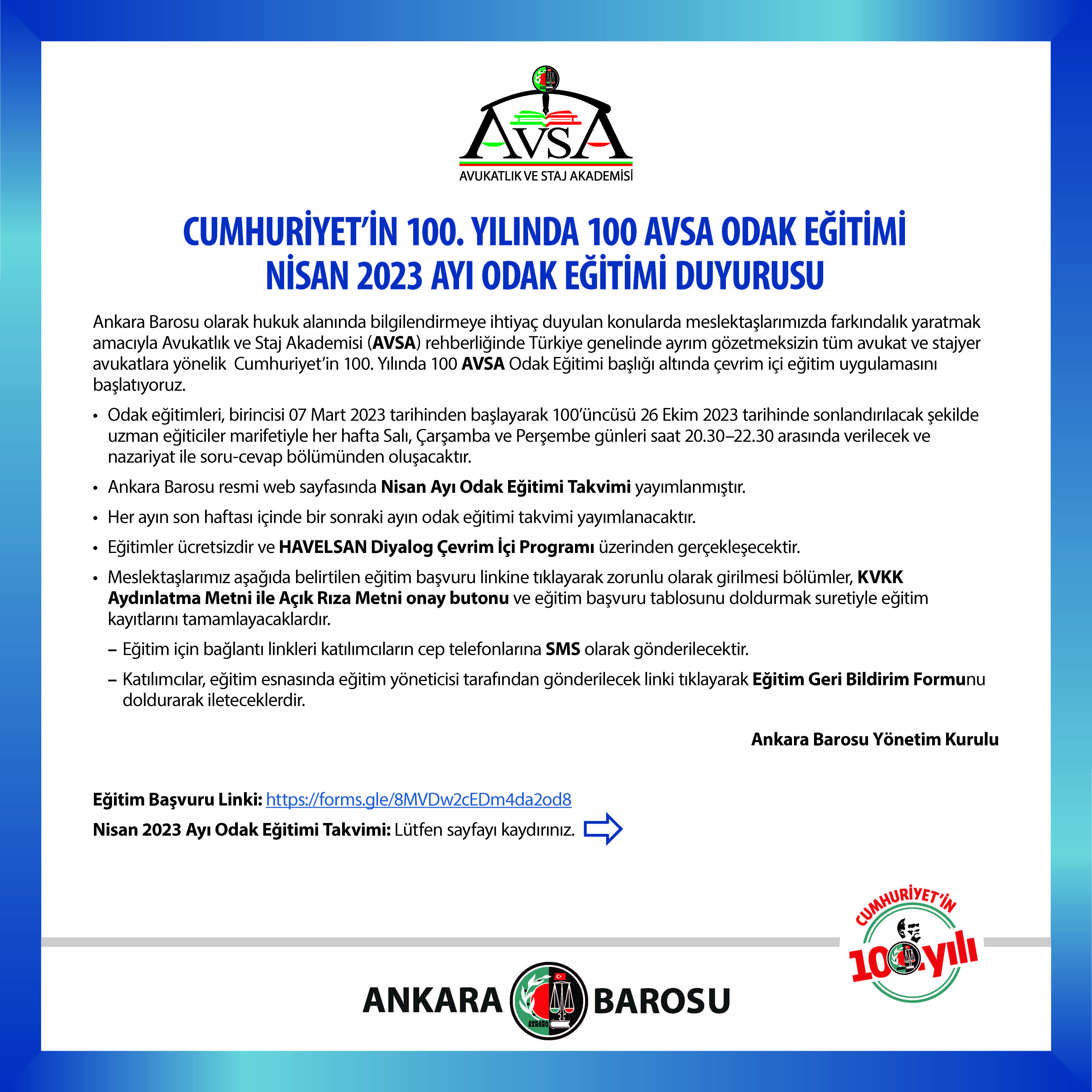 CUMHURİYETİN 100. YILINDA 100 AVSA ODAK EĞİTİMİ NİSAN 2023 AYI ODAK EĞİTİMİ DUYURUSU