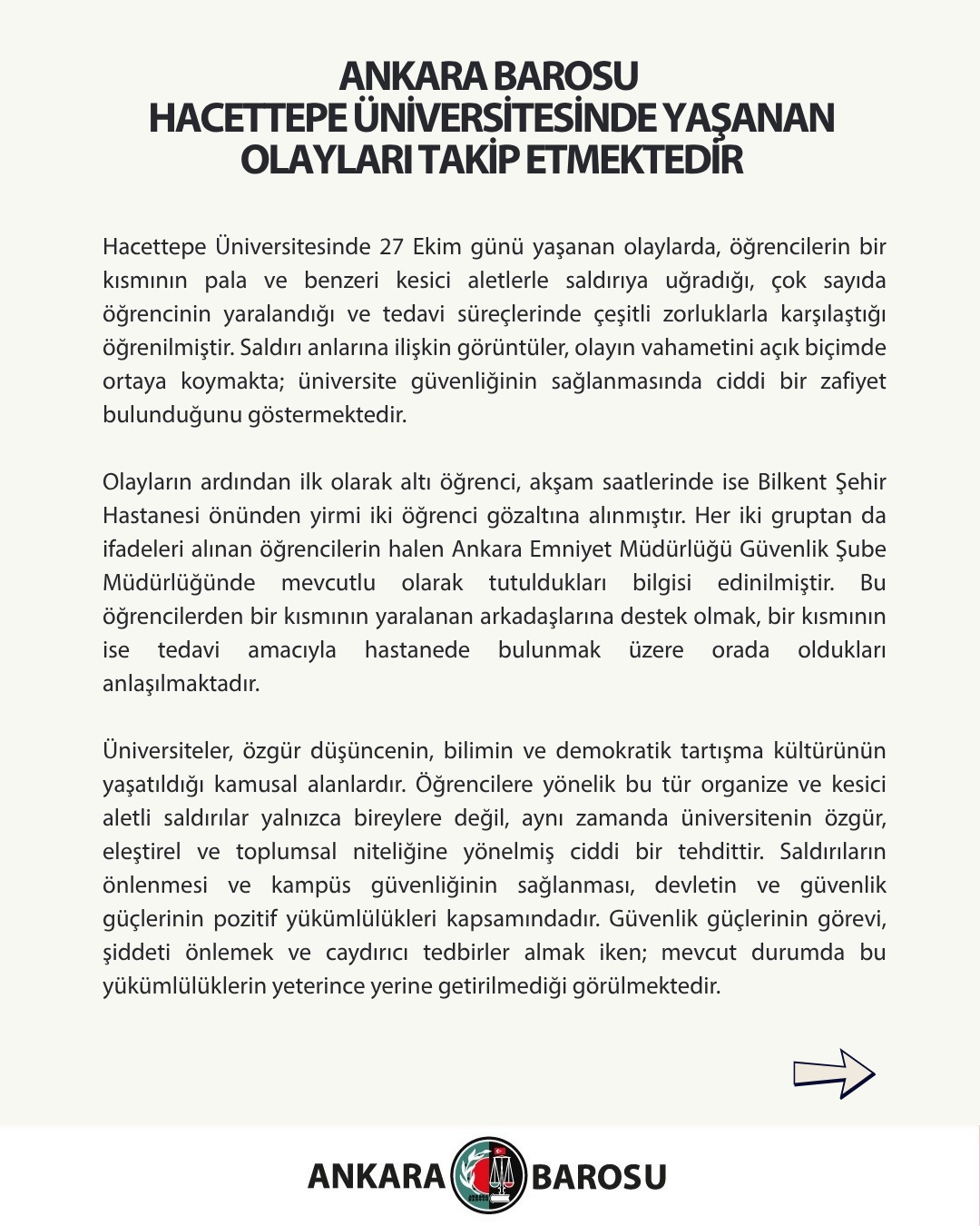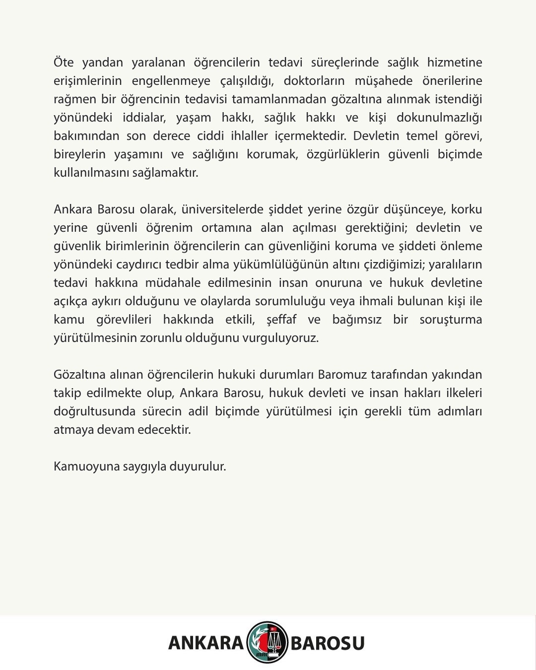 Ankara Barosu olarak, üniversitelerde şiddet yerine özgür düşünceye, korku yerine güvenli öğrenim ortamına alan açılması gerektiğini; devletin ve güvenlik birimlerinin öğrencilerin can güvenliğini koruma ve şiddeti önleme yönündeki caydırıcı tedbir alma yükümlülüğünün altını çizdiğimizi; yaralıların tedavi hakkına müdahale edilmesinin insan onuruna ve hukuk devletine açıkça aykırı olduğunu ve olaylarda sorumluluğu veya ihmali bulunan kişi ile kamu görevlileri hakkında etkili, şeffaf ve bağımsız bir soruşturma yürütülmesinin zorunlu olduğunu vurguluyoruz.