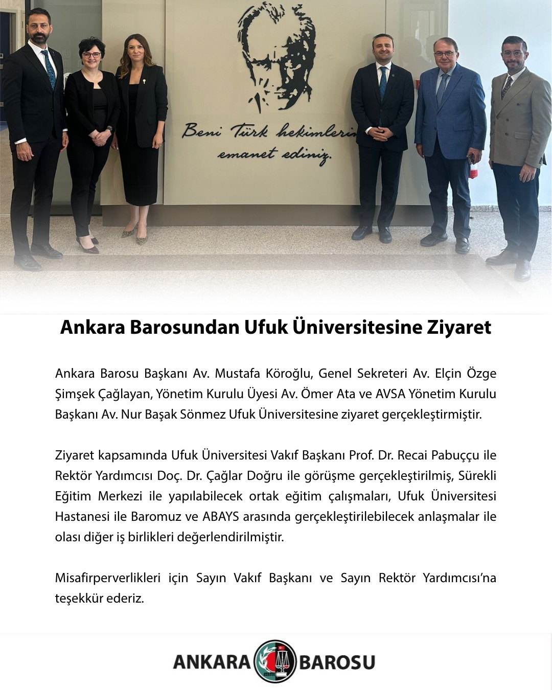 Ankara Barosu Başkanı Av. Mustafa Köroğlu, Genel Sekreteri Av. Elçin Özge Şimşek Çağlayan, Yönetim Kurulu Üyesi Av. Ömer Ata ve AVSA Yönetim Kurulu Başkanı Av. Nur Başak Sönmez Ufuk Üniversitesine ziyaret gerçekleştirmiştir.