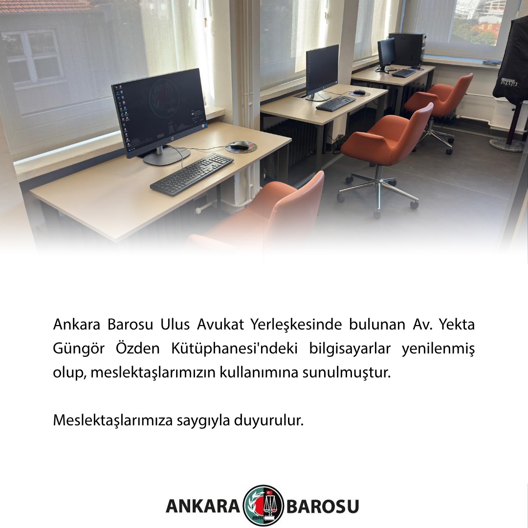 ANKARA BAROSU ULUS AVUKAT YERLEŞKESİNDE BULUNAN AV. YEKTA GÜNGÖR ÖZDEN KÜTÜPHANESİ'NDEKİ BİLGİSAYARLAR YENİLENMİŞ OLUP, MESLEKTAŞLARIMIZIN KULLANIMINA SUNULMUŞTUR.