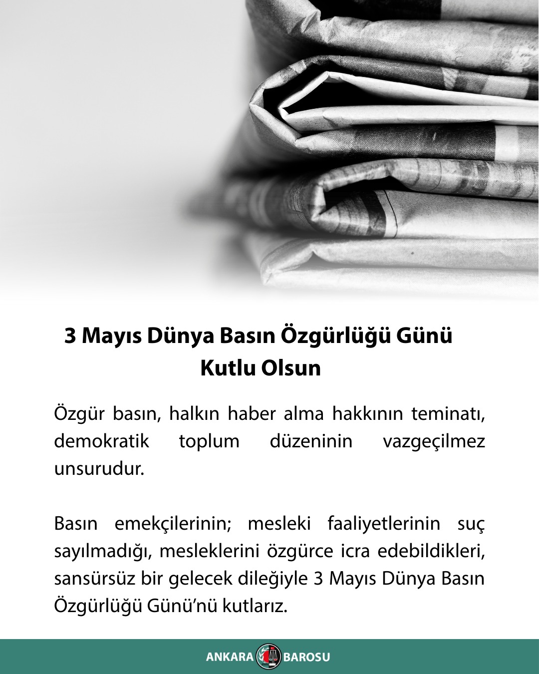 Özgür basın, halkın haber alma hakkının teminatı, demokratik toplum düzeninin vazgeçilmez unsurudur. Basın emekçilerinin; mesleki faaliyetlerinin suç sayılmadığı, mesleklerini özgürce icra edebildikleri, sansürsüz bir gelecek dileğiyle 3 Mayıs Dünya Basın Özgürlüğü Günü’nü kutlarız.