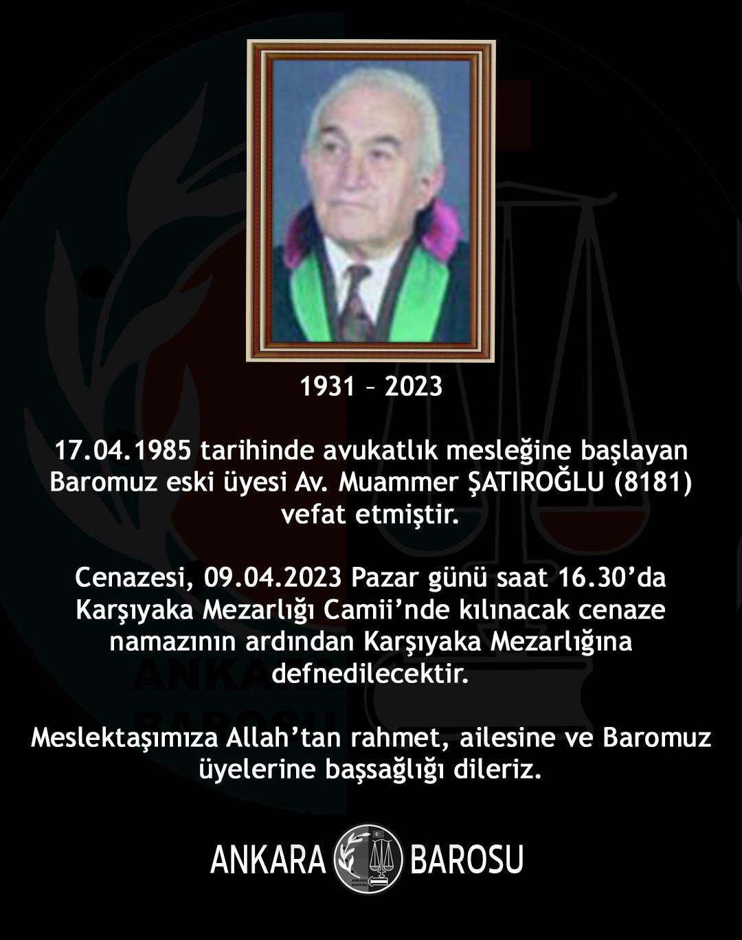 17.04.1985 tarihinde avukatlık mesleğine başlayan Baromuz eski üyesi Av. Muammer ŞATIROĞLU (8181) vefat etmiştir. Cenazesi, 09.04.2023 Pazar günü saat 16.30’da Karşıyaka Mezarlığı Camii’nde kılınacak cenaze namazının ardından Karşıyaka Mezarlığına defnedilecektir. Meslektaşımıza Allah’tan rahmet, ailesine ve Baromuz üyelerine başsağlığı dileriz.