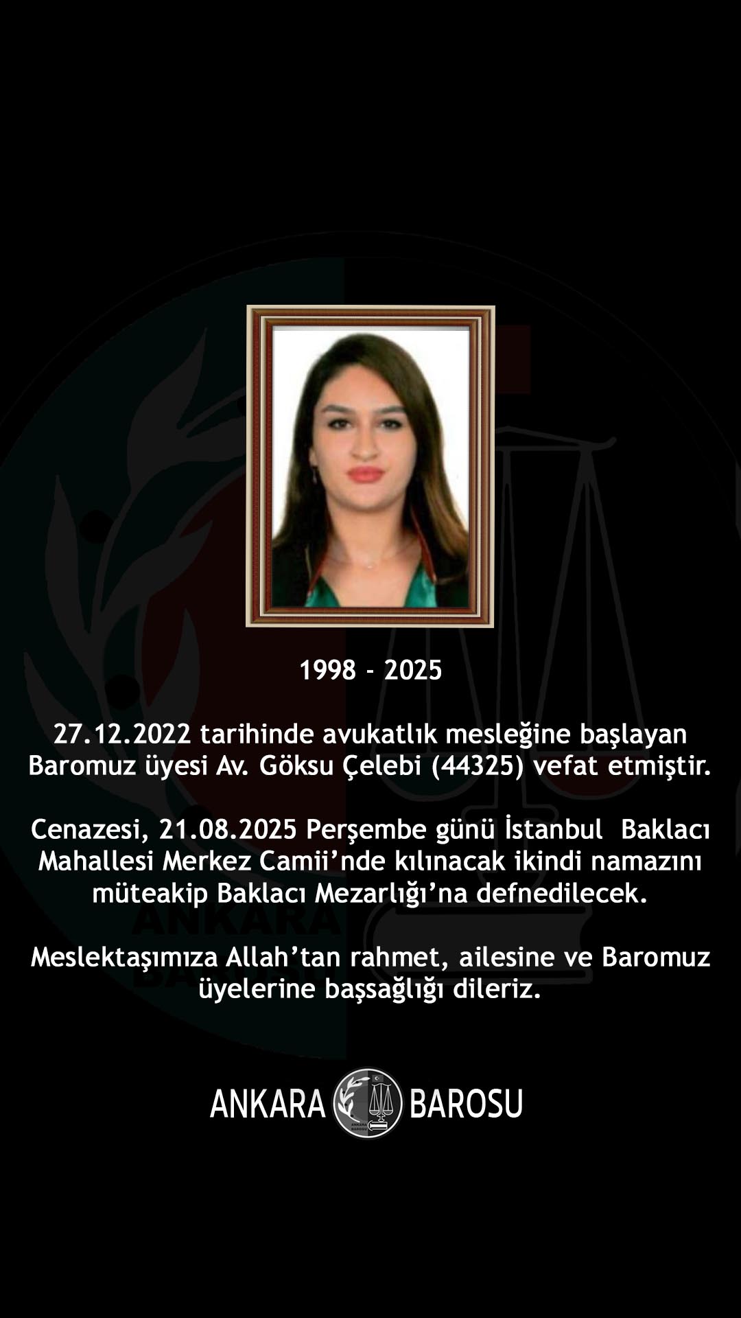27.12.2022 tarihinde avukatlık mesleğine başlayan Baromuz üyesi Av. Göksu Çelebi (44325) vefat etmiştir. Cenazesi, 21.08.2025 Perşembe günü İstanbul Baklacı Mahallesi Merkez Camii’nde kılınacak ikindi namazını müteakip Baklacı Mezarlığı’na defnedilecek. Meslektaşımıza Allah'tan rahmet, ailesine ve Baromuz üyelerine başsağlığı dileriz.