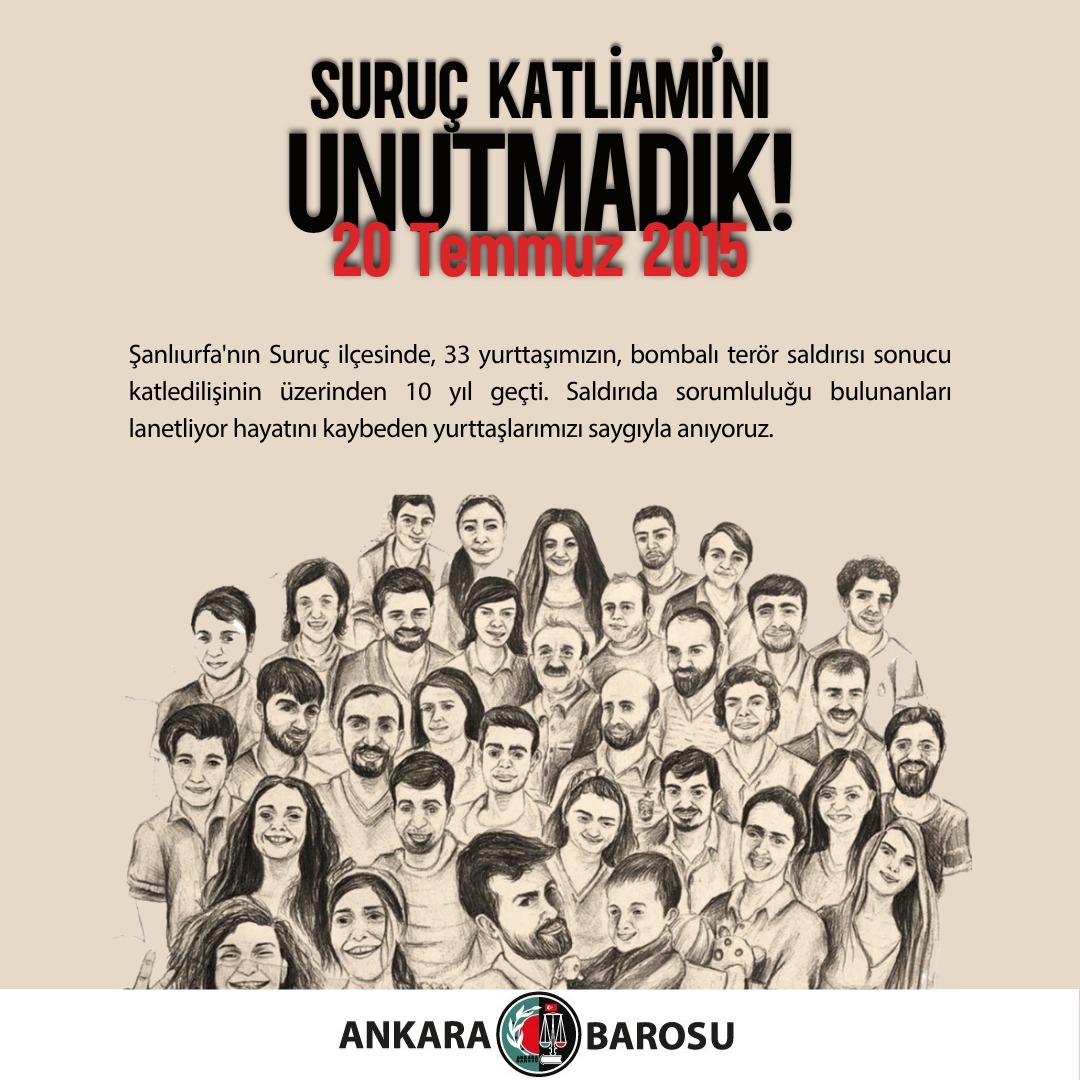 Şanlıurfa'nın Suruç ilçesinde, 33 yurttaşımızın, bombalı terör saldırısı sonucu katledilişinin üzerinden 10 yıl geçti. Saldırıda sorumluluğu bulunanları lanetliyor hayatını kaybeden yurttaşlarımızı saygıyla anıyoruz.