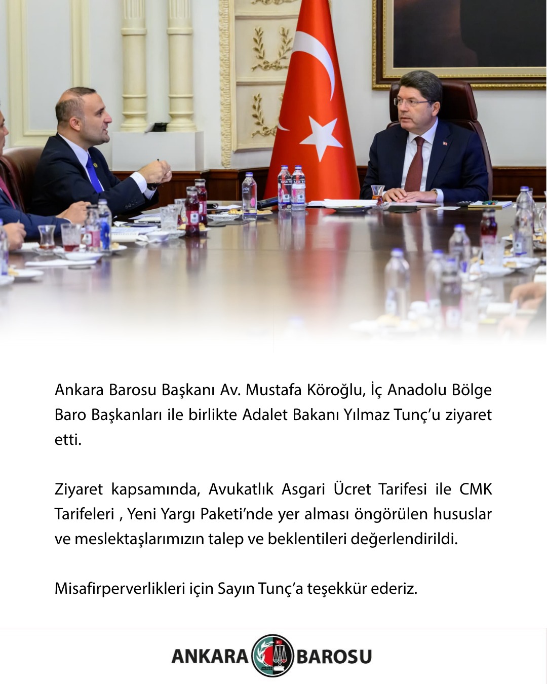 Ankara Barosu Başkanı Av. Mustafa Köroğlu, İç Anadolu Bölge Baro Başkanları ile birlikte Adalet Bakanı Yılmaz Tunç’u ziyaret etti.