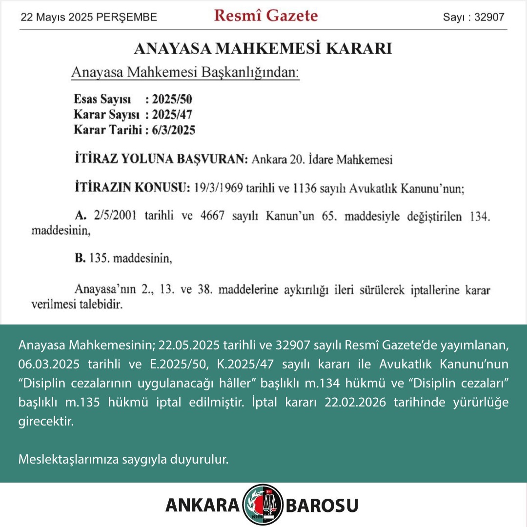 ANAYASA MAHKEMESİ, AVUKATLIK KANUNU’NUN DİSİPLİN DÜZENLEMELERİNE İLİŞKİN BİR KISIM HÜKMÜNÜN İPTALİNE KARAR VERMİŞTİR