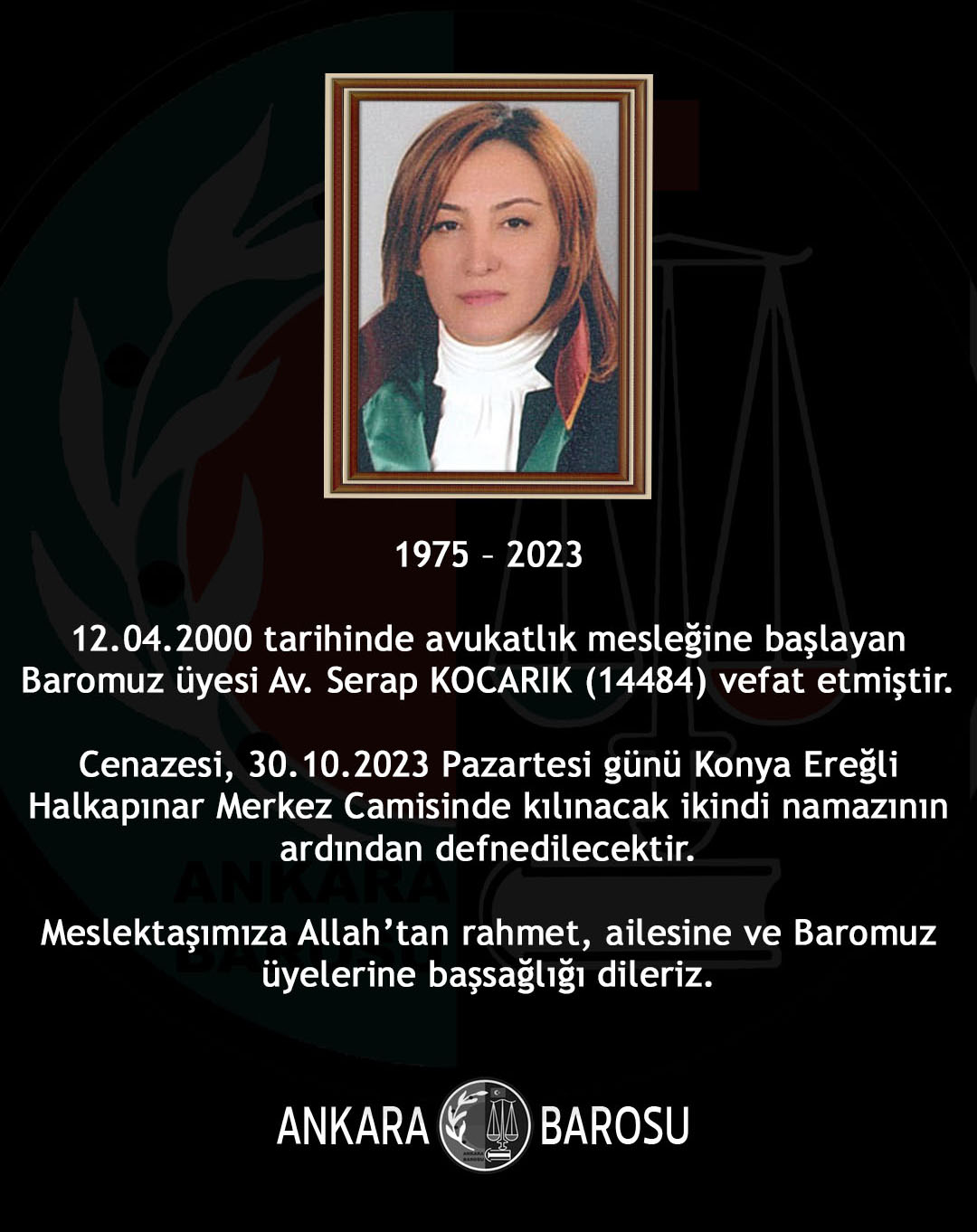 12.04.2000 tarihinde avukatlık mesleğine başlayan Baromuz üyesi Av. Serap KOCARIK (14484) vefat etmiştir. Cenazesi, 30.10.2023 Pazartesi günü Konya Ereğli Halkapınar Merkez Camisinde kılınacak ikindi namazının ardından defnedilecektir. Meslektaşımıza Allah’tan rahmet, ailesine ve Baromuz üyelerine başsağlığı dileriz.