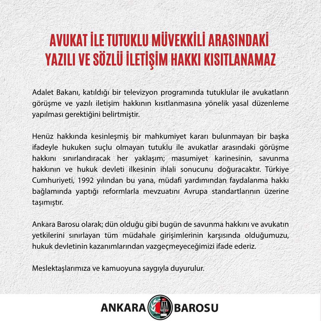 Ankara Barosu olarak; dün olduğu gibi bugün de savunma hakkını ve avukatın yetkilerini sınırlayan tüm müdahale girişimlerinin karşısında olduğumuzu, hukuk devletinin kazanımlarından vazgeçmeyeceğimizi ifade ederiz.