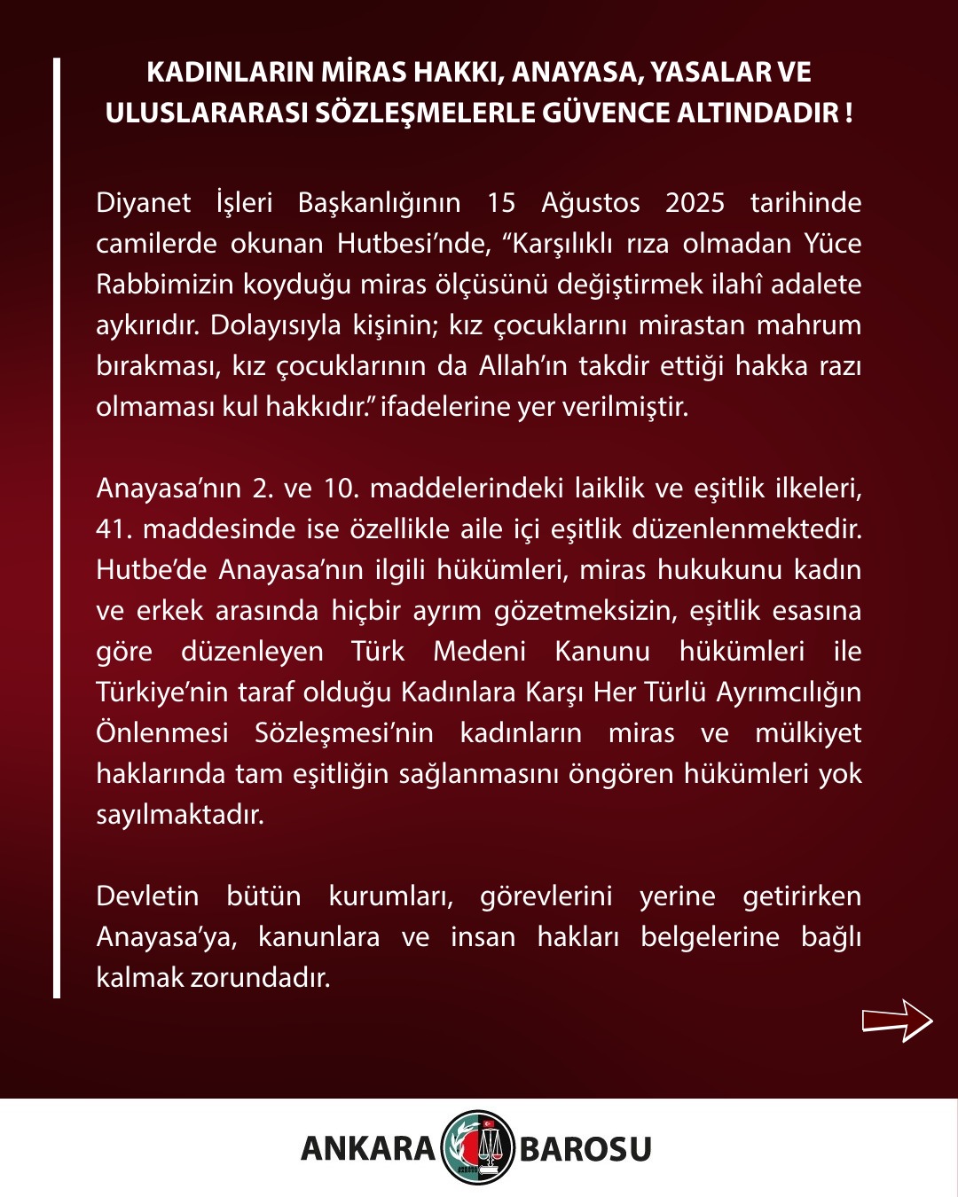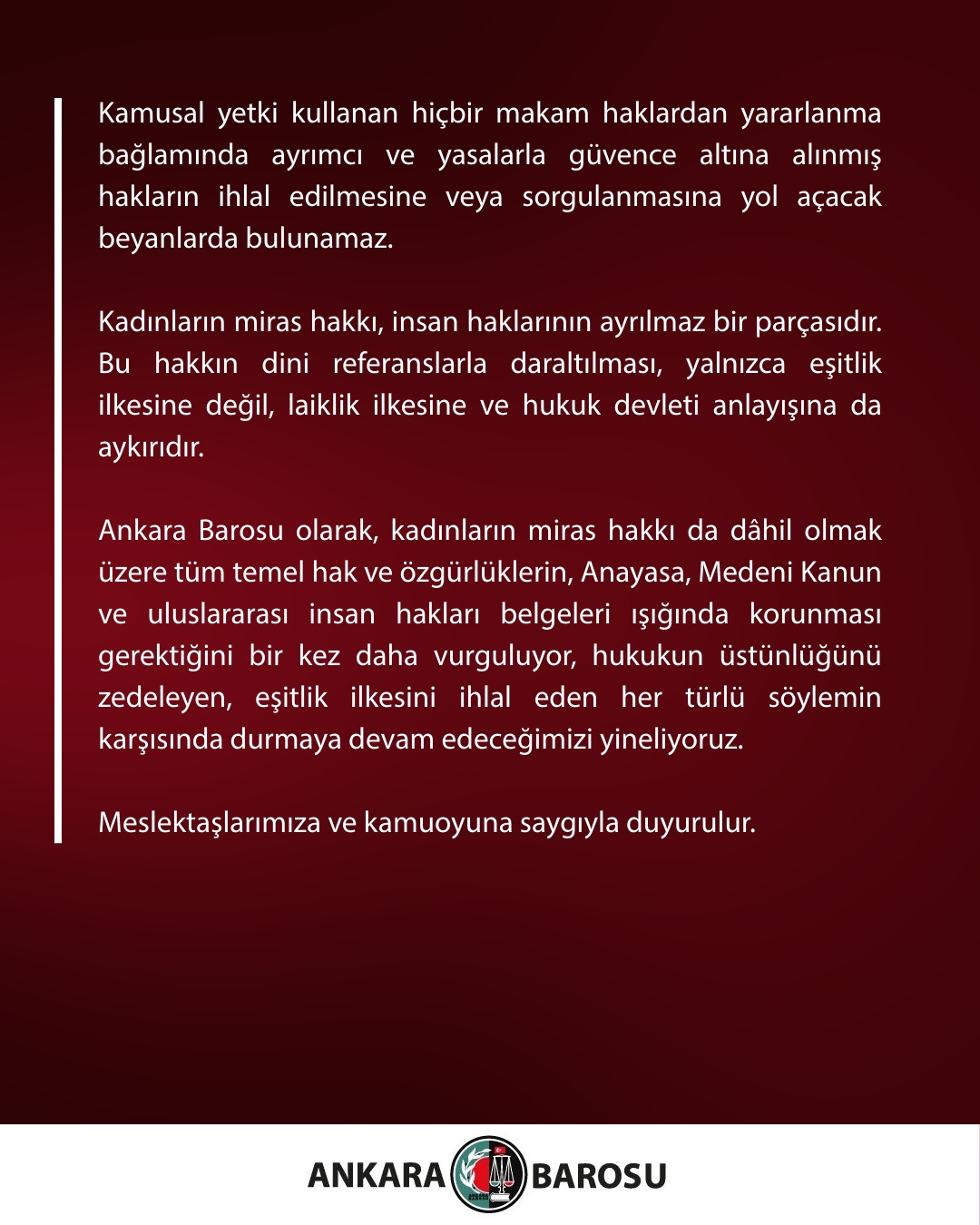 Ankara Barosu olarak, kadınların miras hakkı da dâhil olmak üzere tüm temel hak ve özgürlüklerin, Anayasa, Medeni Kanun ve uluslararası insan hakları belgeleri ışığında korunması gerektiğini bir kez daha vurguluyor, hukukun üstünlüğünü zedeleyen, eşitlik ilkesini ihlal eden her türlü söylemin karşısında durmaya devam edeceğimizi yineliyoruz.