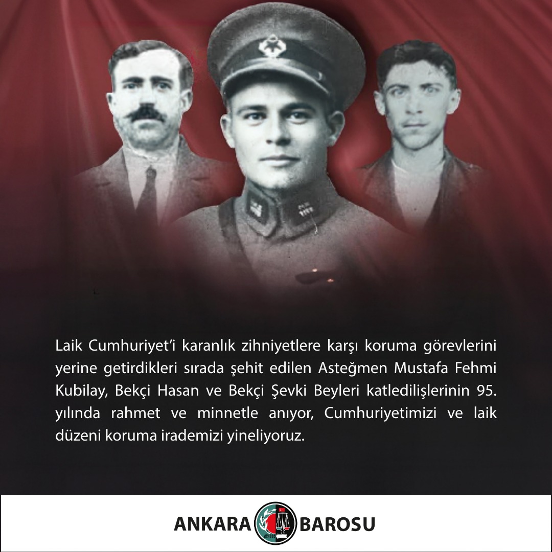 LAİK CUMHURİYET’İ KARANLIK ZİHNİYETLERE KARŞI KORUMA GÖREVLERİNİ YERİNE GETİRDİKLERİ SIRADA ŞEHİT EDİLEN ASTEĞMEN MUSTAFA FEHMİ KUBİLAY, BEKÇİ HASAN VE BEKÇİ ŞEVKİ BEYLERİ KATLEDİLİŞLERİNİN 95. YILINDA RAHMET VE MİNNETLE ANIYOR, CUMHURİYETİMİZİ VE LAİK DÜZENİ KORUMA İRADEMİZİ YİNELİYORUZ.