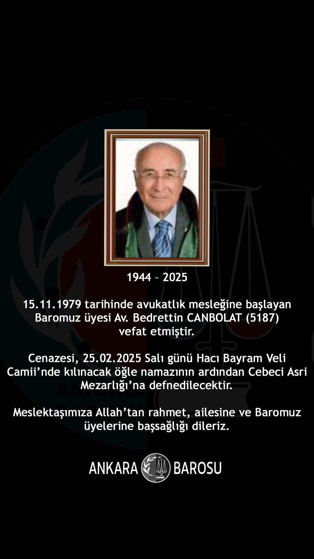 BAROMUZ ÜYESİ AV. BEDRETTİN CANBOLAT (5187) VEFAT ETMİŞTİR