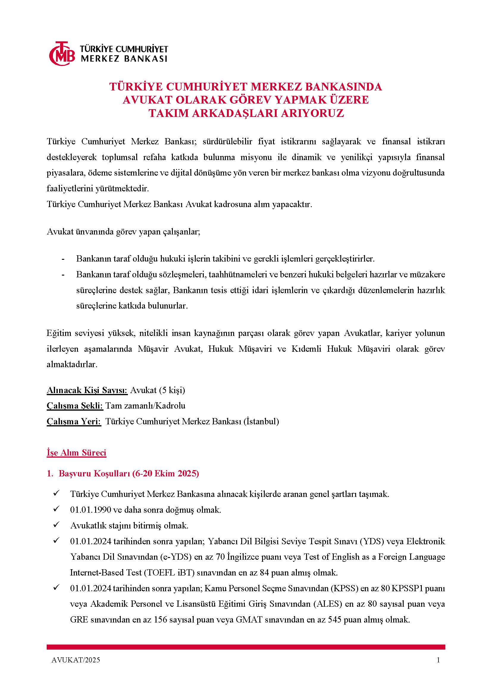 Dinamik ve yenilikçi yapısıyla finansal piyasalara, ödeme sistemlerine ve dijital dönüşüme yön veren bir merkez bankası olma vizyonuyla hareket eden Türkiye Cumhuriyet Merkez Bankası, bünyesinde görev yapmak üzere Avukat kadrosuna alım yapacaktır.