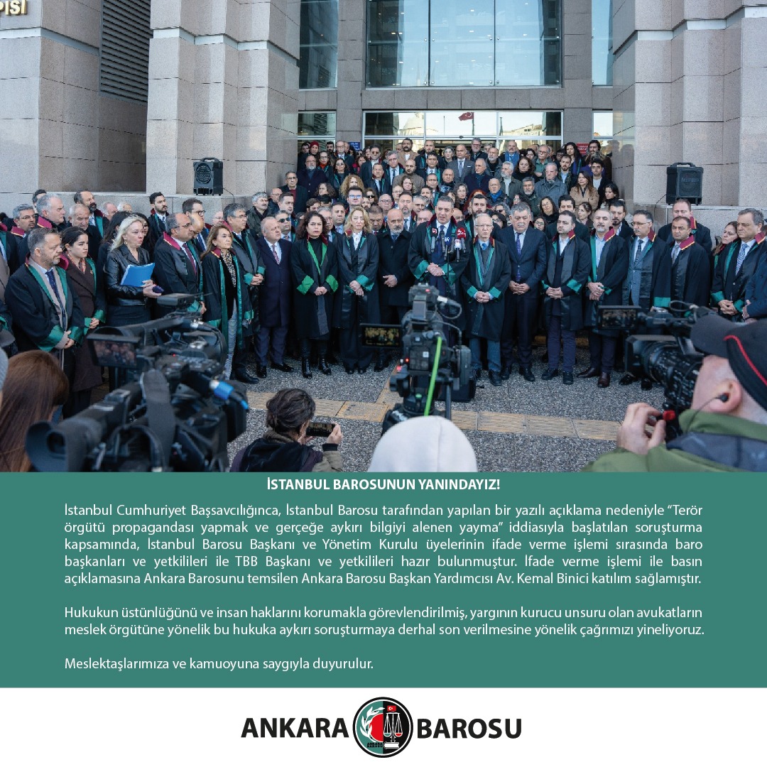 İstanbul Cumhuriyet Başsavcılığınca, İstanbul Barosu tarafından yapılan bir yazılı açıklama nedeniyle “Terör örgütü propagandası yapmak ve gerçeğe aykırı bilgiyi alenen yayma” iddiasıyla başlatılan soruşturma kapsamında, İstanbul Barosu Başkanı ve Yönetim Kurulu üyelerinin ifade verme işlemi sırasında baro başkanları ve yetkilileri ile TBB Başkanı ve yetkilileri hazır bulunmuştur. İfade verme işlemi ile basın açıklamasına Ankara Barosunu temsilen Ankara Barosu Başkan Yardımcısı Av. Kemal Binici katılım sağlamıştır.