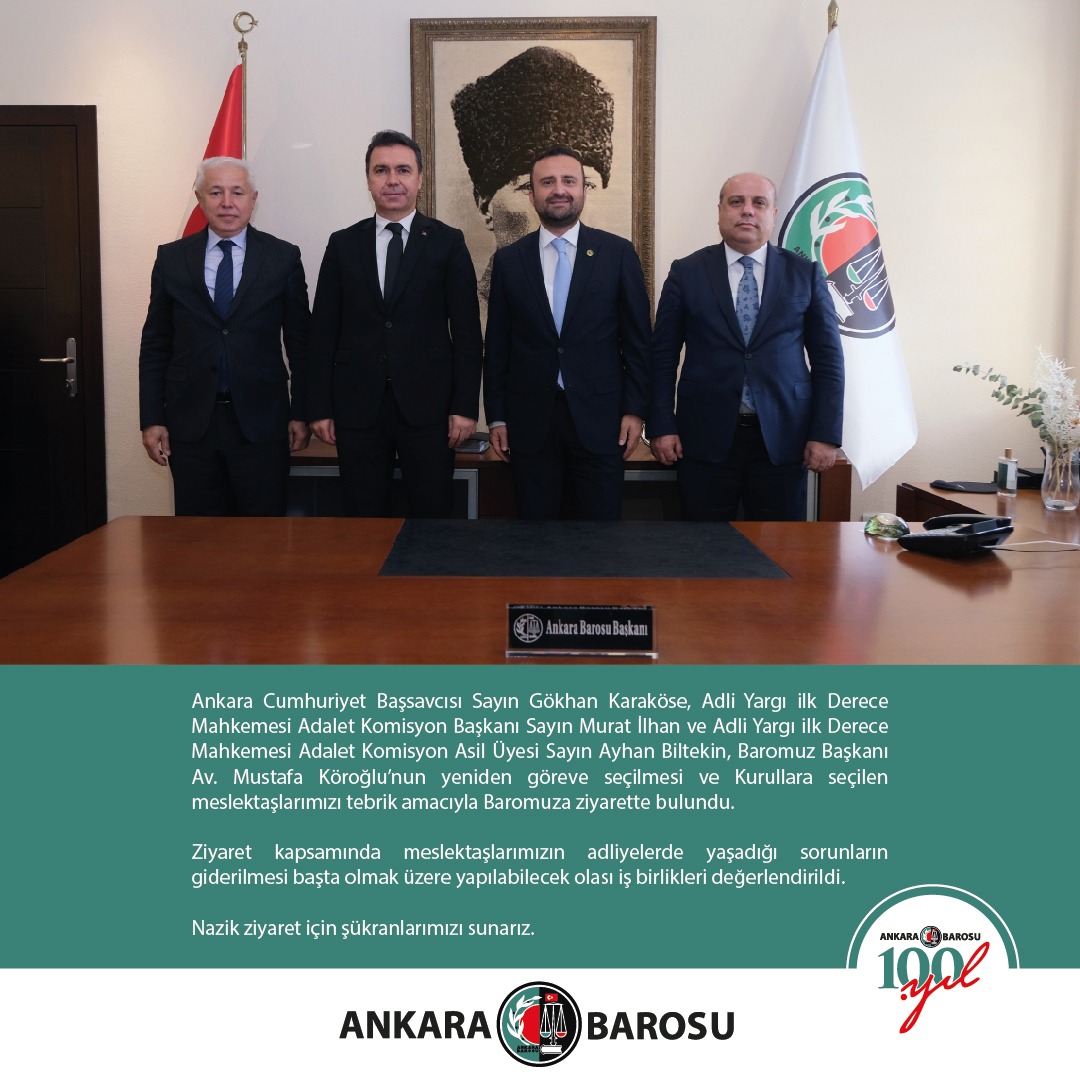 ANKARA CUMHURİYET BAŞSAVCISI SAYIN GÖKHAN KARAKÖSE, ADLİ YARGI İLK DERECE MAHKEMESİ ADALET KOMİSYON BAŞKANI SAYIN MURAT İLHAN VE ADLİ YARGI İLK DERECE MAHKEMESİ ADALET KOMİSYON ASİL ÜYESİ SAYIN AYHAN BİLTEKİN, BAROMUZ BAŞKANI AV. MUSTAFA KÖROĞLU’NUN YENİDEN GÖREVE SEÇİLMESİ VE KURULLARA SEÇİLEN MESLEKTAŞLARIMIZI TEBRİK AMACIYLA BAROMUZA ZİYARETTE BULUNDU.
