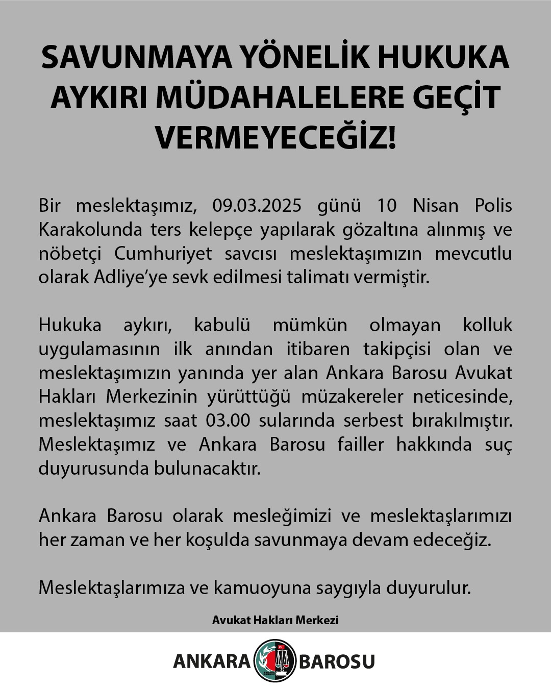 Hukuka aykırı, kabulü mümkün olmayan kolluk uygulamasının ilk anından itibaren takipçisi olan ve meslektaşımızın yanında yer alan Ankara Barosu Avukat Hakları Merkezinin yürüttüğü müzakereler neticesinde, meslektaşımız saat 03.00 sularında serbest bırakılmıştır. Meslektaşımız ve Ankara Barosu failler hakkında suç duyurusunda bulunacaktır.