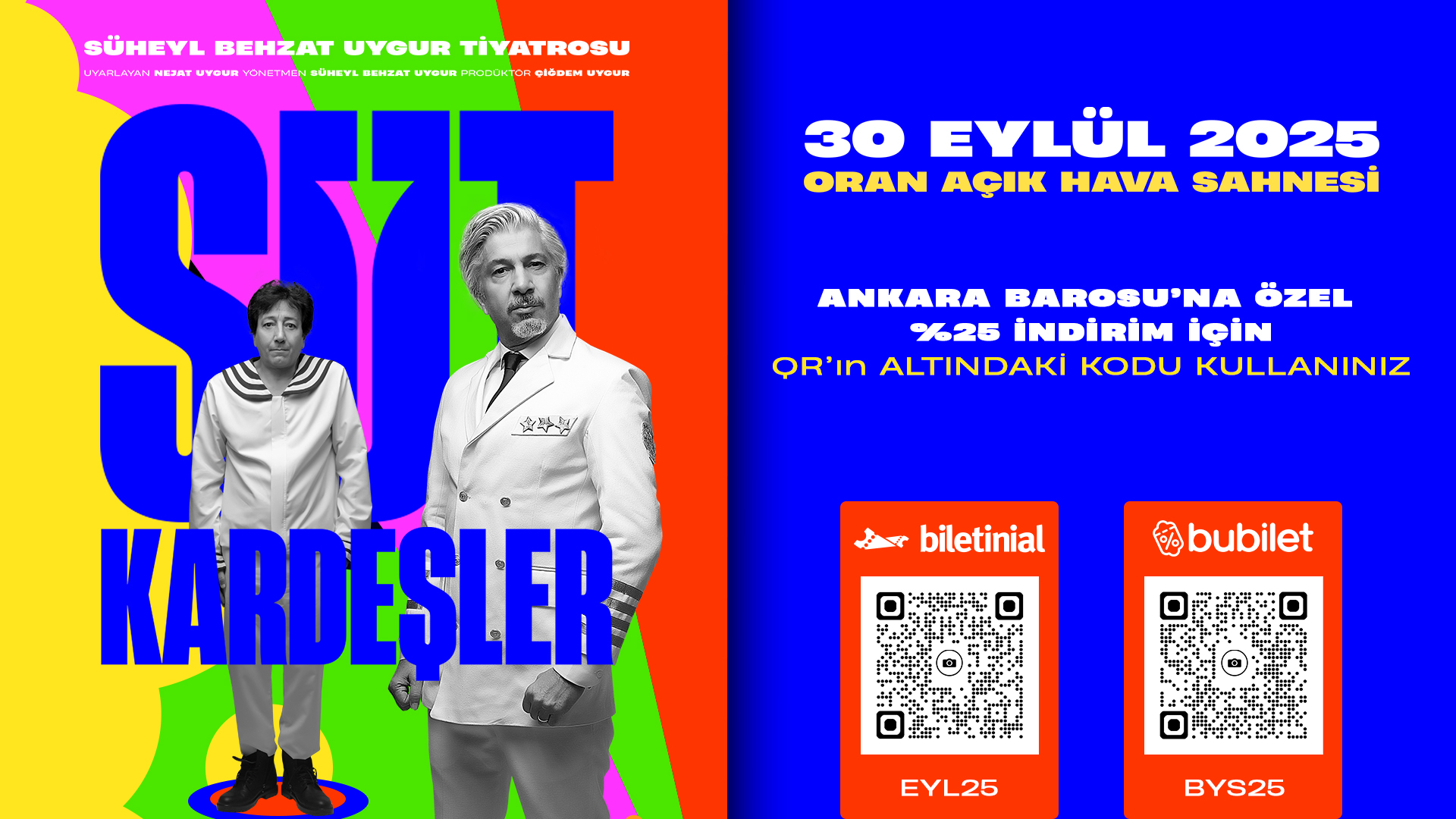 Beyas Organizasyon İnş. Taş. Tic. Ltd. Şti. olarak 30 Eylül Salı günü 20:30'da Oran Açık Hava Sahnesi'nde "Süt Kardeşler" isimli tiyatro gösterisini organize etmekteyiz. Firma olarak değerli avukatlarımız için tiyatromuza özel %25 indirim kodu tanımlatmış bulunmaktayız.