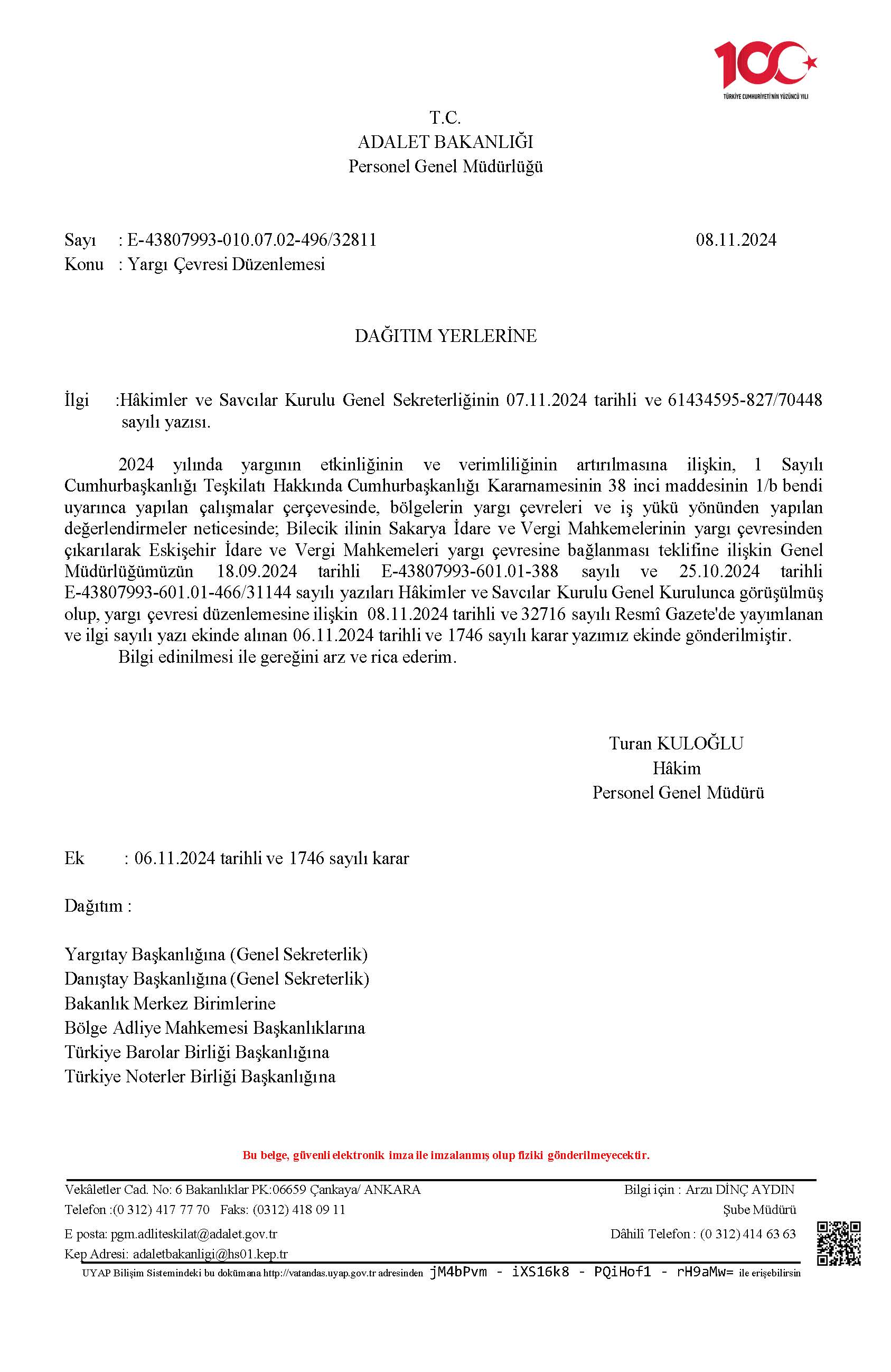HÂKİMLER VE SAVCILAR KURULU GENEL SEKRETERLİĞİ'NİN 07.11.2024 TARİHLİ VE 61434595-827/70448 SAYILI YAZISI