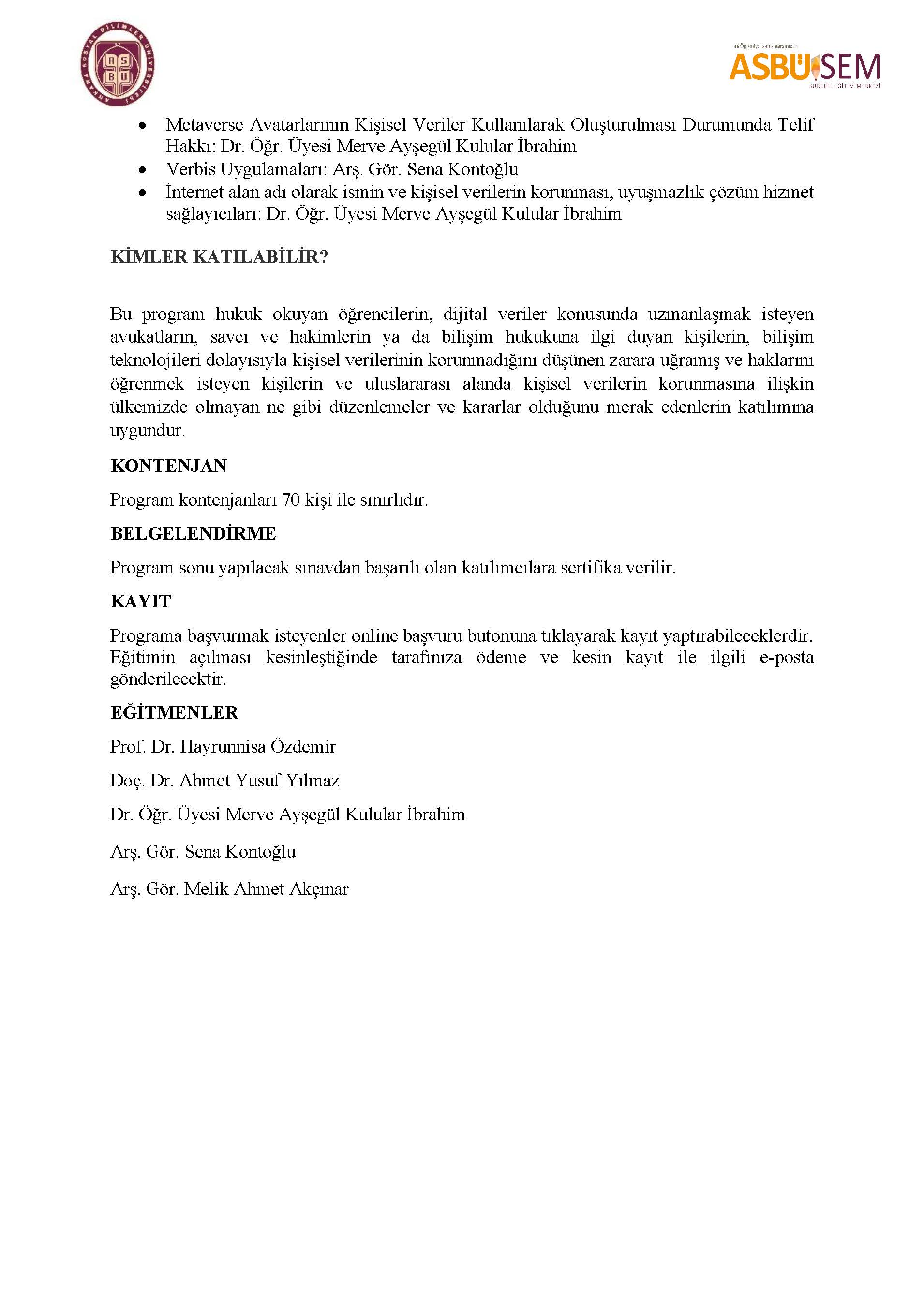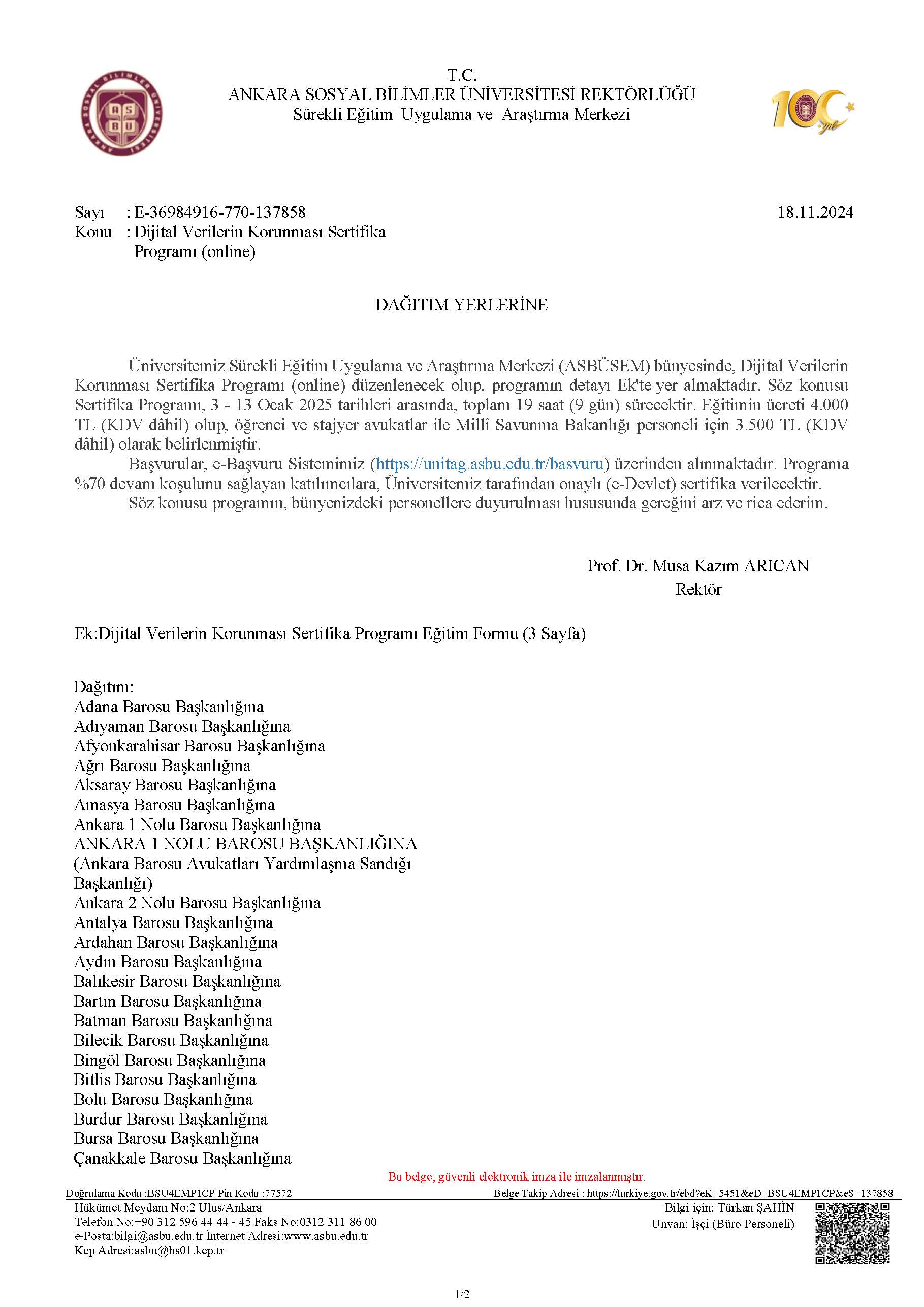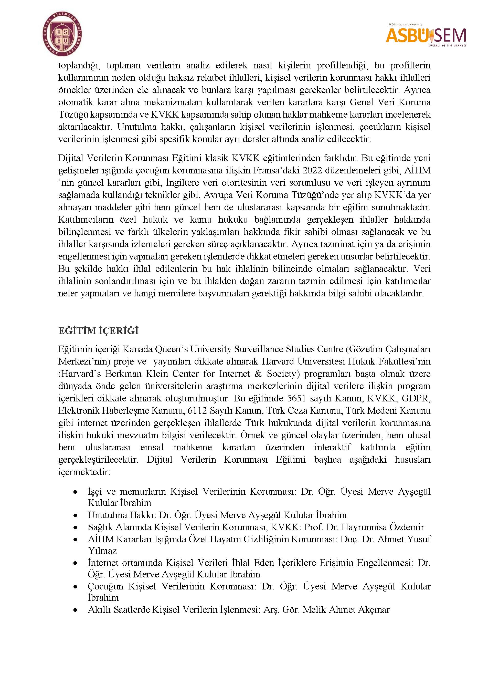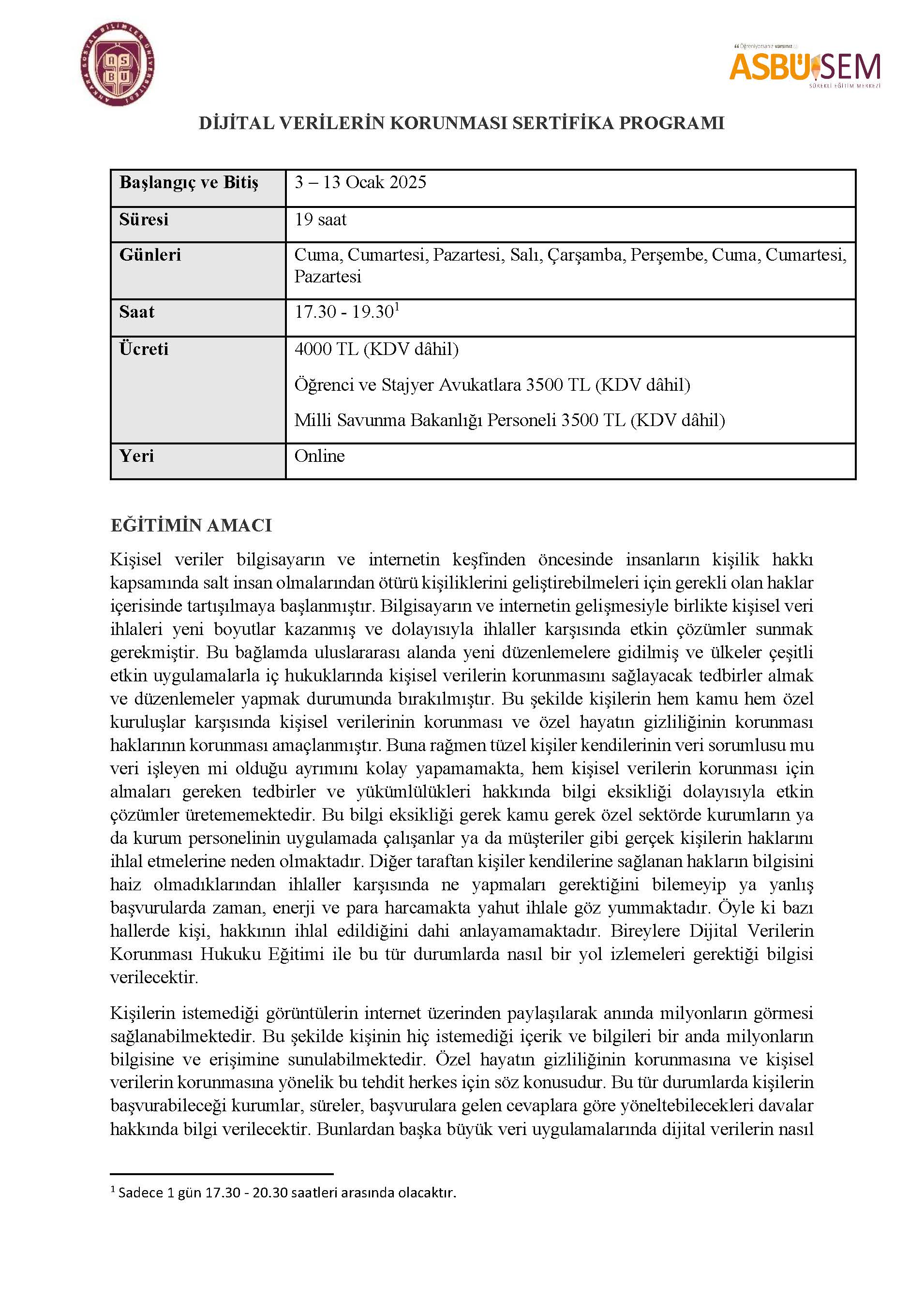 Üniversitemiz Sürekli Eğitim Uygulama ve Araştırma Merkezi (ASBÜSEM) bünyesinde, Dijital Verilerin Korunması Sertifika Programı (online) düzenlenecek olup, programın detayı Ek'te yer almaktadır. Söz konusu Sertifika Programı, 3 - 13 Ocak 2025 tarihleri arasında, toplam 19 saat (9 gün) sürecektir. Eğitimin ücreti 4.000 TL (KDV dâhil) olup, öğrenci ve stajyer avukatlar ile Millî Savunma Bakanlığı personeli için 3.500 TL (KDV dâhil) olarak belirlenmiştir.