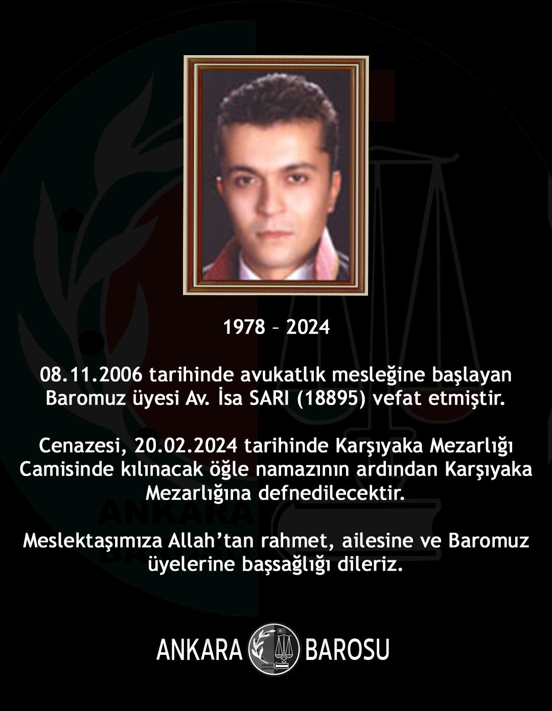 BAROMUZ ÜYESİ AV. İSA SARI (18895) VEFAT ETMİŞTİR