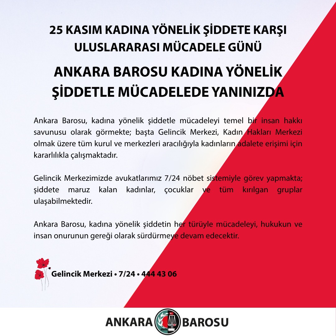 Ankara Barosu, kadına yönelik şiddetle mücadeleyi temel bir insan hakkı savunusu olarak görmekte; başta Gelincik Merkezi, Kadın Hakları Merkezi olmak üzere tüm kurul ve merkezleri aracılığıyla kadınların adalete erişimi için kararlılıkla çalışmaktadır.