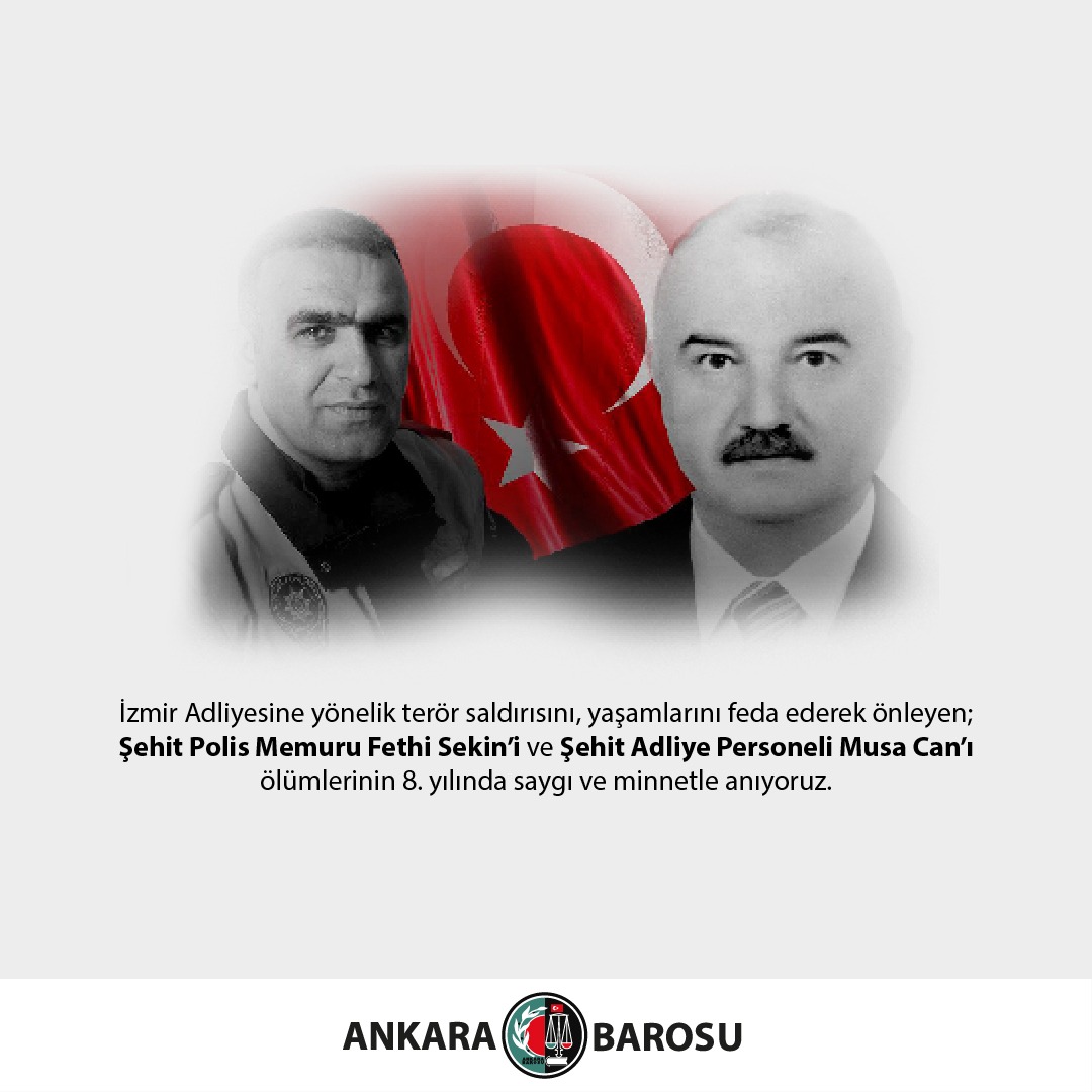İZMİR ADLİYESİNE YÖNELİK TERÖR SALDIRISINI, YAŞAMLARINI FEDA EDEREK ÖNLEYEN; ŞEHİT POLİS MEMURU FETHİ SEKİN’İ VE ŞEHİT ADLİYE PERSONELİ MUSA CAN’I ÖLÜMLERİNİN 8. YILINDA SAYGI VE MİNNETLE ANIYORUZ.