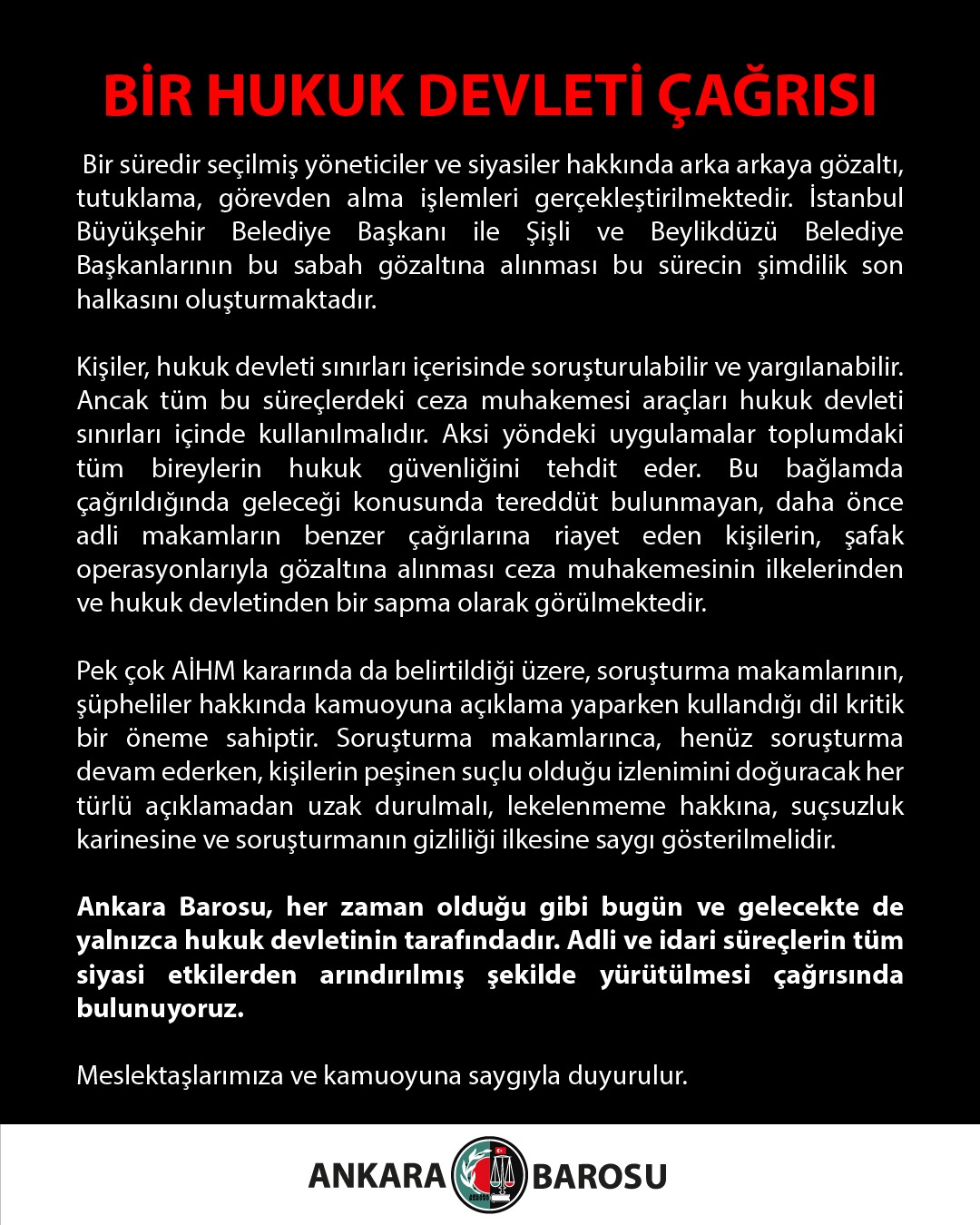 Ankara Barosu, her zaman olduğu gibi bugün ve gelecekte de yalnızca hukuk devletinin tarafındadır. Adli ve idari süreçlerin tüm siyasi etkilerden arındırılmış şekilde yürütülmesi çağrısında bulunuyoruz.