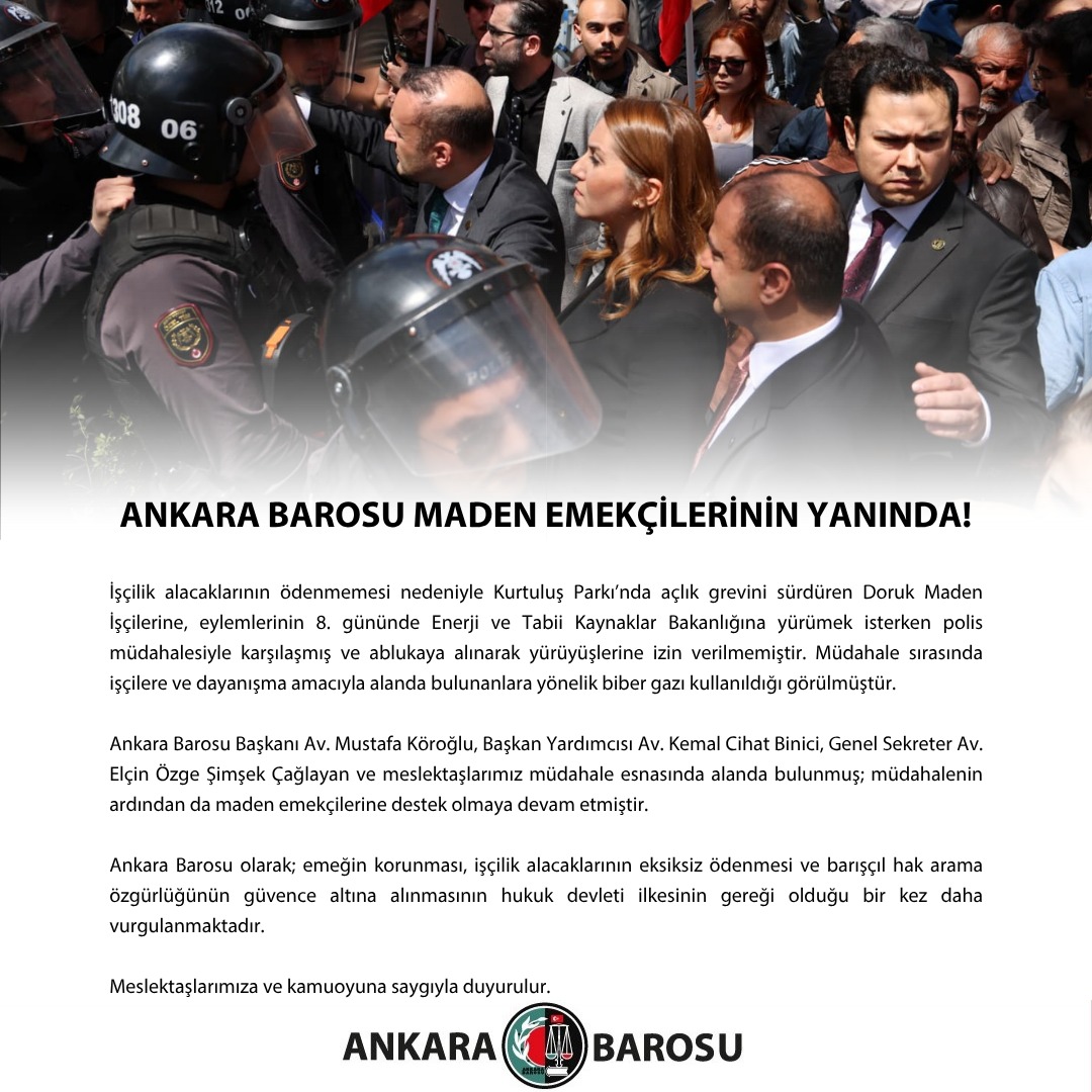 Ankara Barosu olarak; emeğin korunması, işçilik alacaklarının eksiksiz ödenmesi ve barışçıl hak arama özgürlüğünün güvence altına alınmasının hukuk devleti ilkesinin gereği olduğu bir kez daha vurgulanmaktadır.