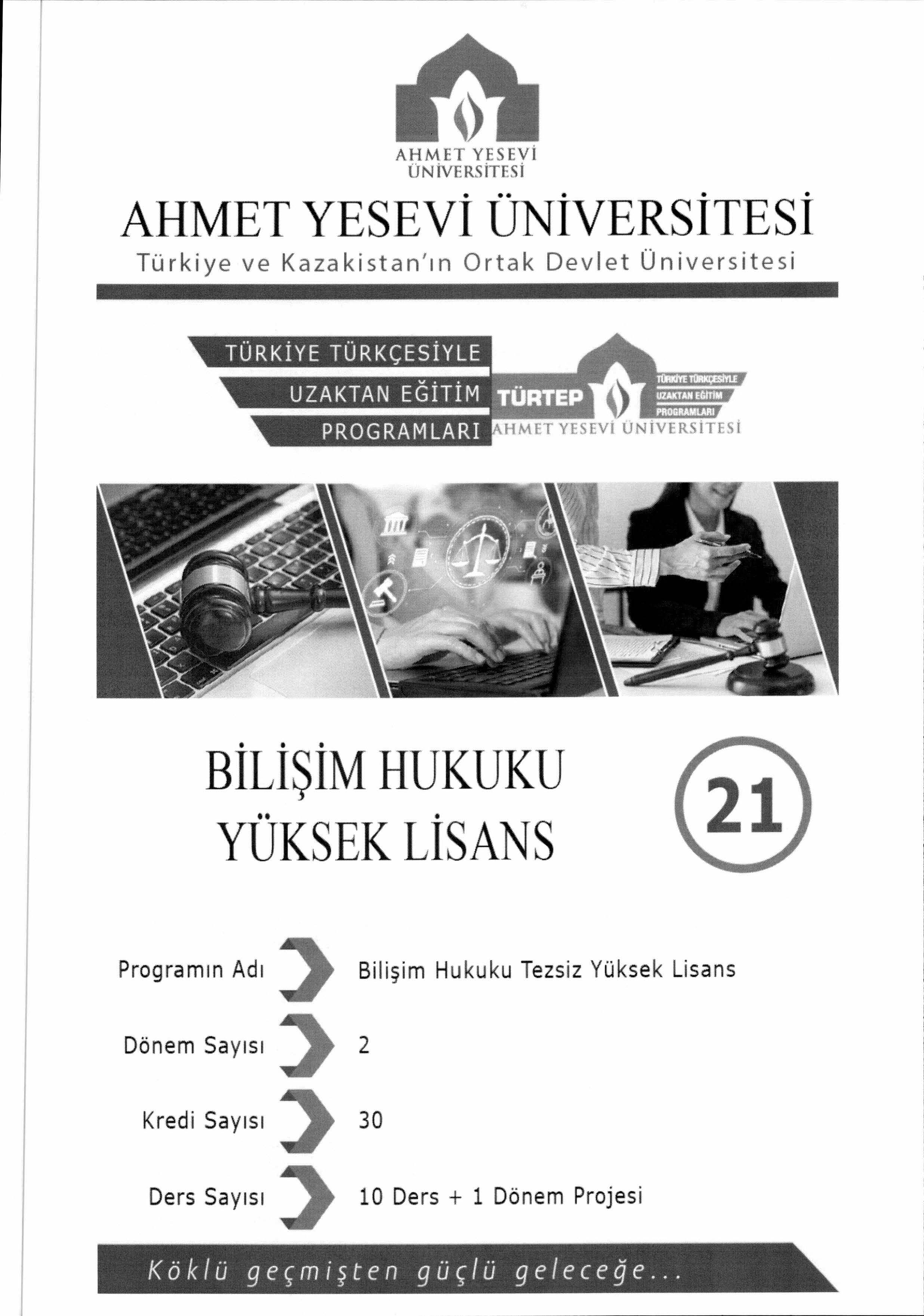 Ahmet Yesevi Üniversitesi Türkiye Türkçesiyle Eğitim Programları Araştırma ve U ygulam a Merkezi Müdürlüğü bünyesinde, 2025-2026 eğitim-öğretim yılı itibarıyla “ Bilişim Hukuku Tezsiz Yüksek Lisans Programı” açılmıştır.