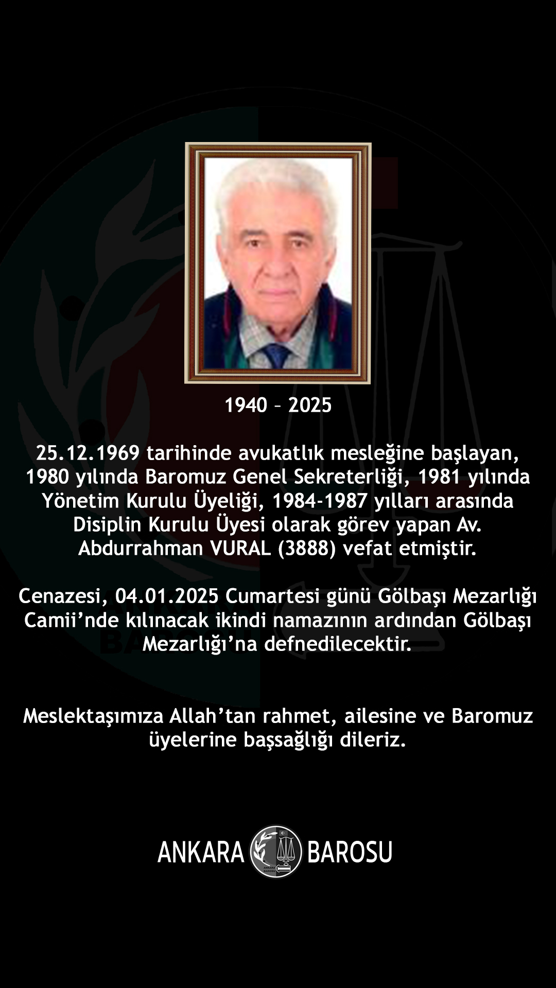 BAROMUZ ÜYESİ AV. ABDURRAHMAN VURAL (3888) VEFAT ETMİŞTİR