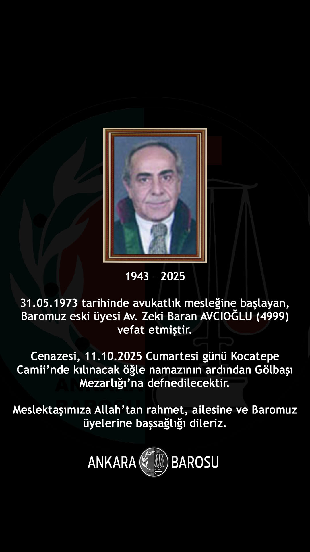 31.05.1973 tarihinde avukatlık mesleğine başlayan, Baromuz eski üyesi Av. Zeki Baran AVCIOĞLU (4999) vefat etmiştir. Cenazesi, 11.10.2025 Cumartesi günü Kocatepe Camii’nde kılınacak öğle namazının ardından Gölbaşı Mezarlığı’na defnedilecektir. Meslektaşımıza Allah'tan rahmet, ailesine ve Baromuz üyelerine başsağlığı dileriz.