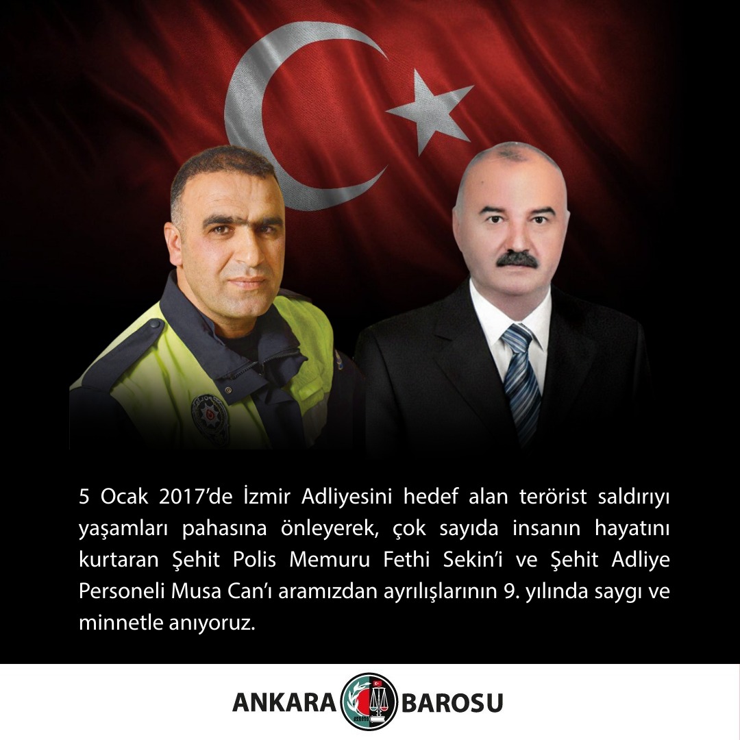 5 OCAK 2017’DE İZMİR ADLİYESİNİ HEDEF ALAN TERÖRİST SALDIRIYI YAŞAMLARI PAHASINA ÖNLEYEREK, ÇOK SAYIDA İNSANIN HAYATINI KURTARAN ŞEHİT POLİS MEMURU FETHİ SEKİN’İ Ve ŞEHİT ADLİYE PERSONELİ MUSA CAN’I ARAMIZDAN AYRILIŞLARININ 9. YILINDA SAYGI VE MİNNETLE ANIYORUZ.