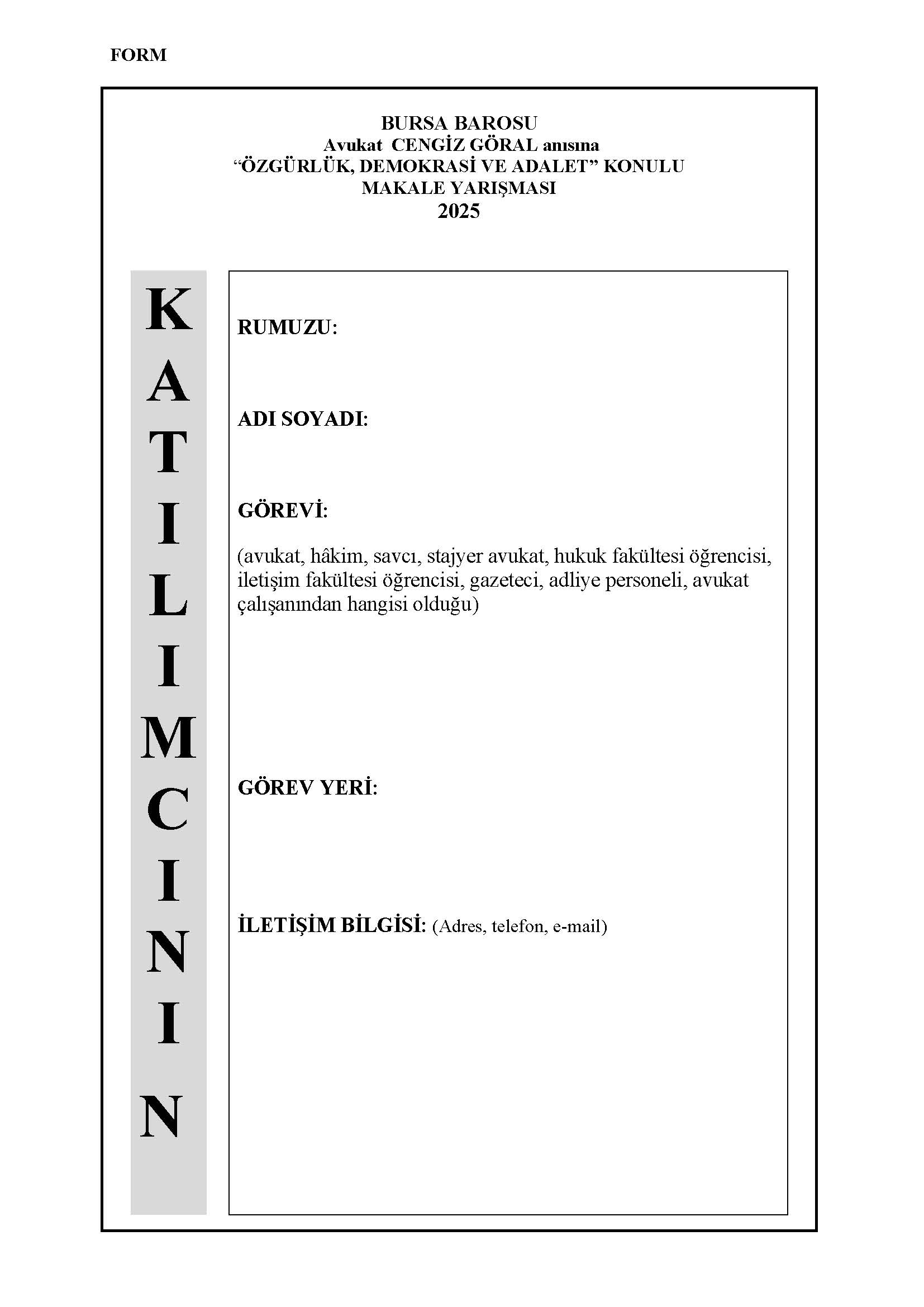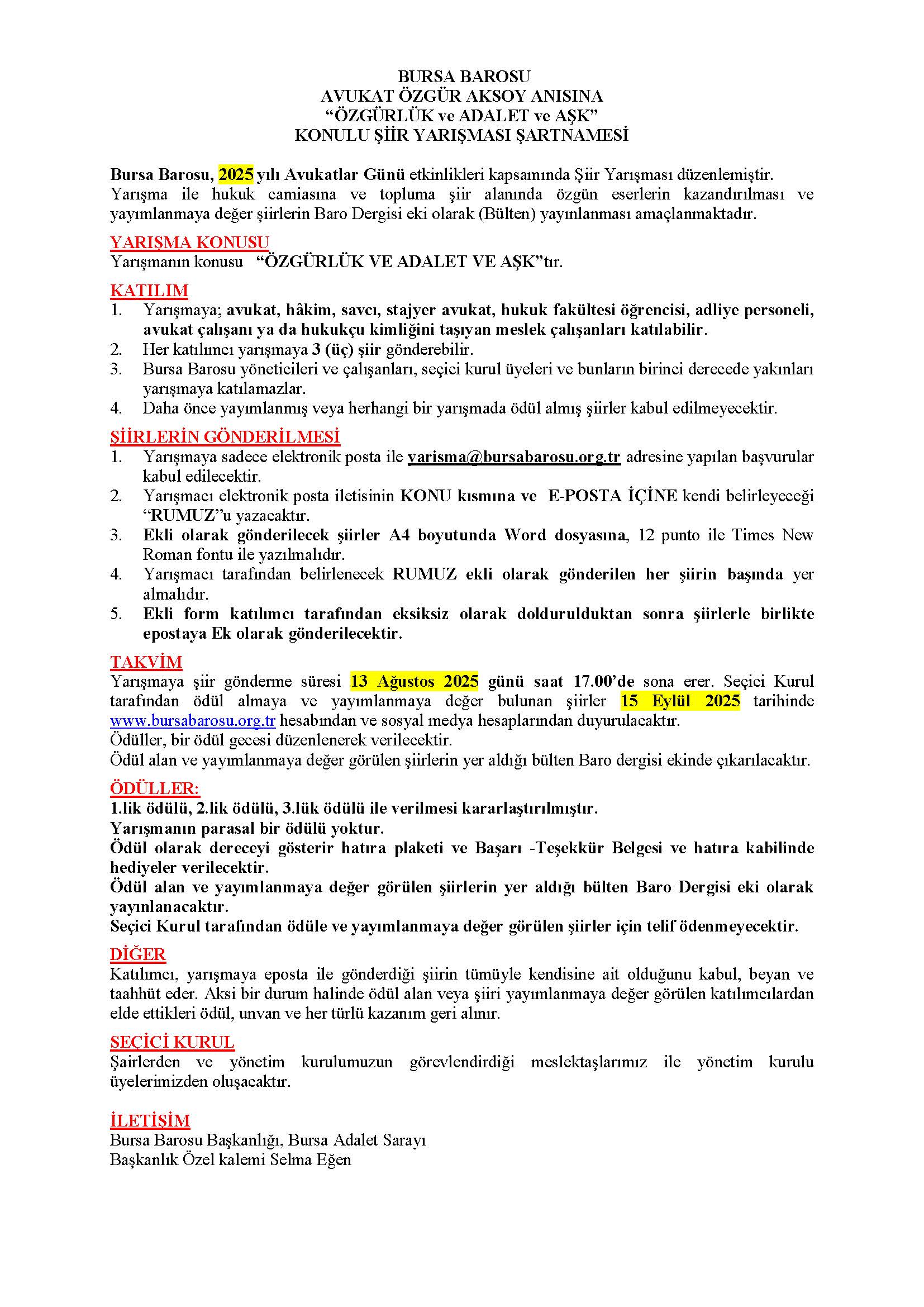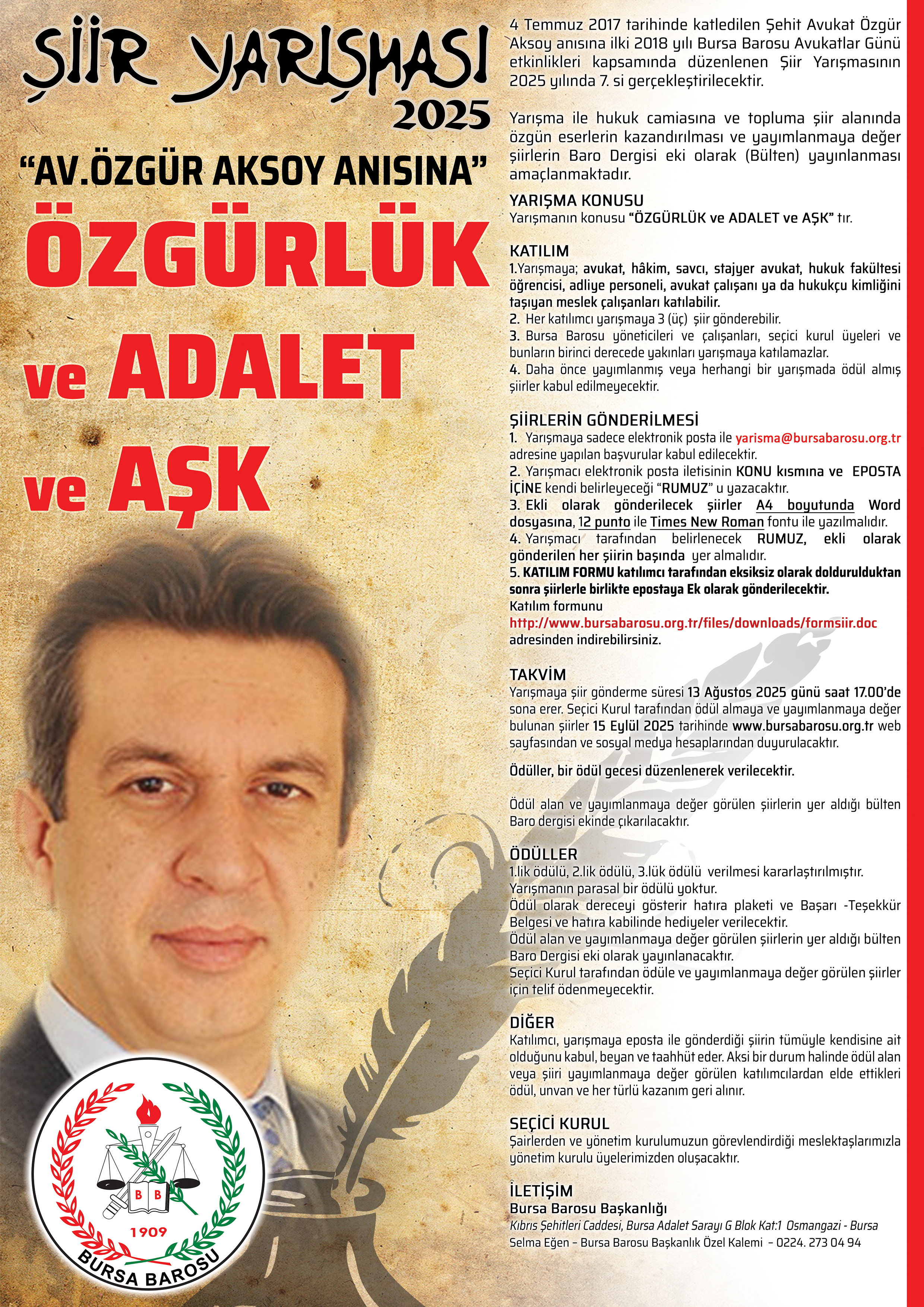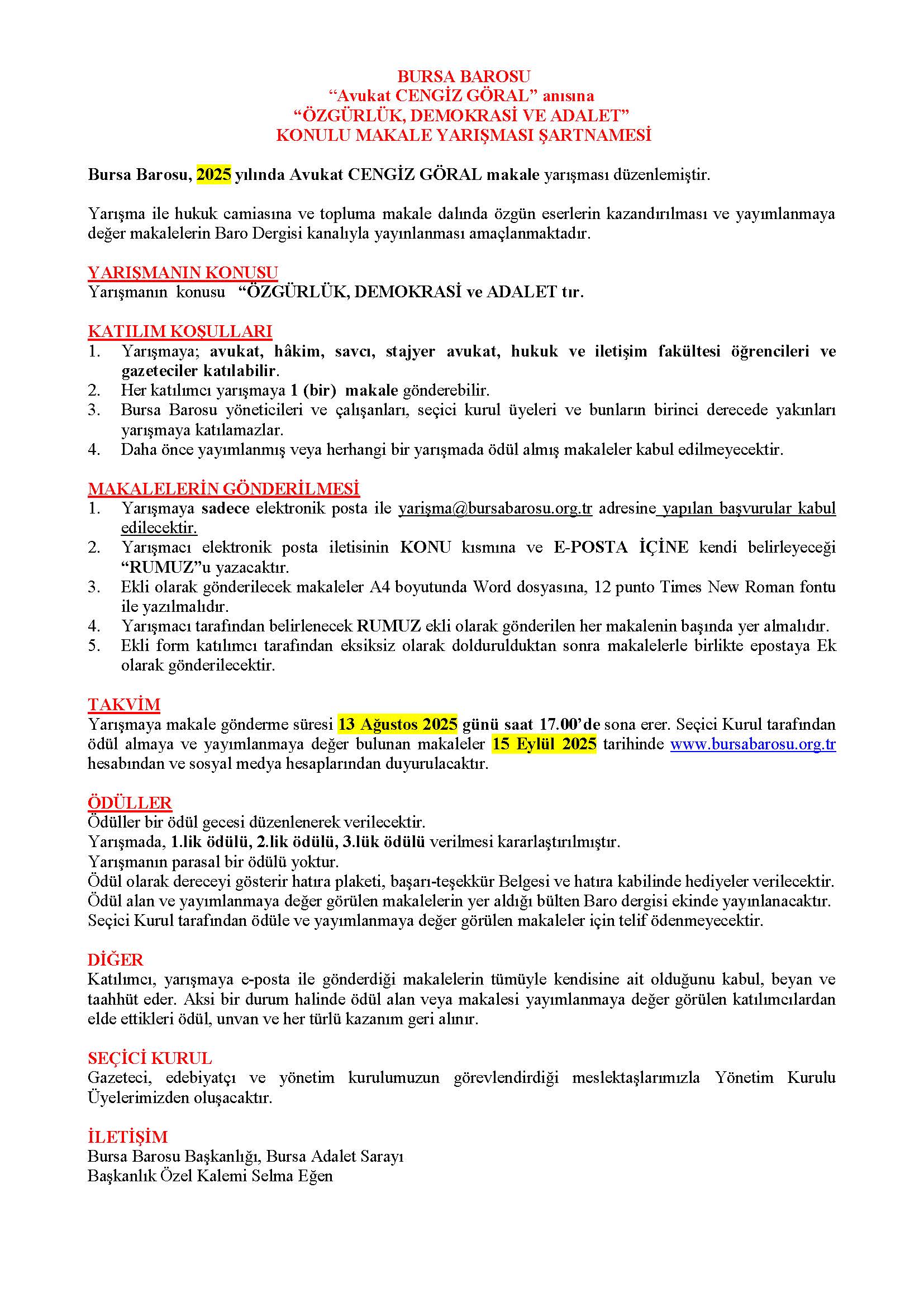 1979 yılında menfur bir saldırı sonucu katledilen Av. M. Cengiz Göral anısına ilki 2018 yılında gerçekleştirilen ve bu yıl altıncısı düzenlenen “Özgürlük, Demokrasi ve Adalet” temalı makale yarışmasına yarışmacılar yalnız bir makale ile katılabileceklerdir. 4 Temmuz 2017 tarihinde Gemlik’te uğradığı silahlı saldırı sonucu hayatını kaybeden Av. Özgür Aksoy anısına bu yıl altıncısı düzenlenen “Özgürlük ve Adalet ve Aşk” temalı şiir yarışmasına ise yarışmacılar en fazla 3 şiir ile katılabileceklerdir.