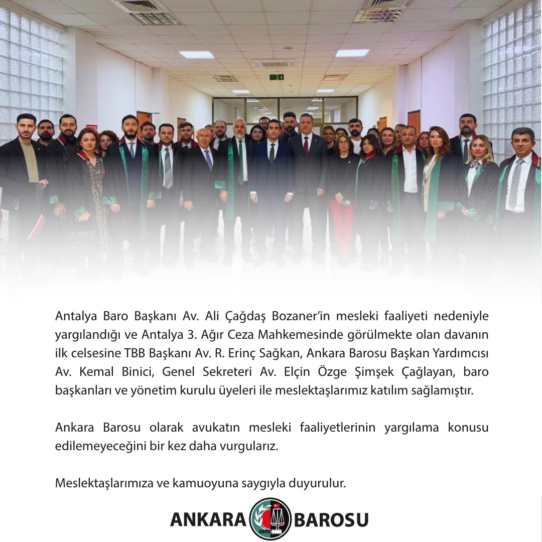 Antalya Baro Başkanı Av. Ali Çağdaş Bozaner’in mesleki faaliyeti nedeniyle yargılandığı ve Antalya 3. Ağır Ceza Mahkemesinde görülmekte olan davanın ilk celsesine TBB Başkanı Av. R. Erinç Sağkan, Ankara Barosu Başkan Yardımcısı Av. Kemal Binici, Genel Sekreteri Av. Elçin Özge Şimşek Çağlayan, baro başkanları ve yönetim kurulu üyeleri ile meslektaşlarımız katılım sağlamıştır.
