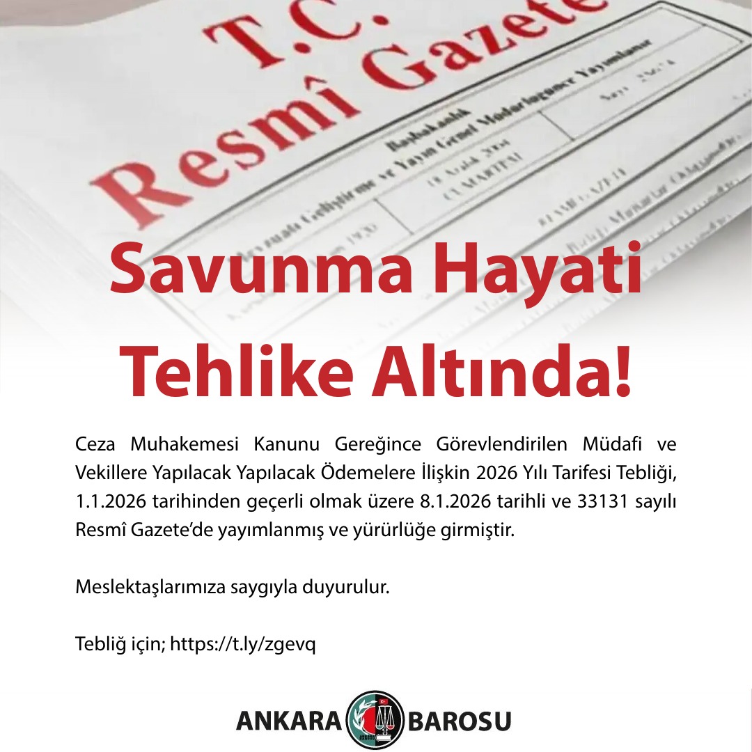 Ceza Muhakemesi Kanunu Gereğince Görevlendirilen Müdafi ve Vekillere Yapılacak Yapılacak Ödemelere İlişkin 2026 Yılı Tarifesi Tebliği, 1.1.2026 tarihinden geçerli olmak üzere 8.1.2026 tarihli ve 33131 sayılı Resmî Gazete’de yayımlanmış ve yürürlüğe girmiştir.