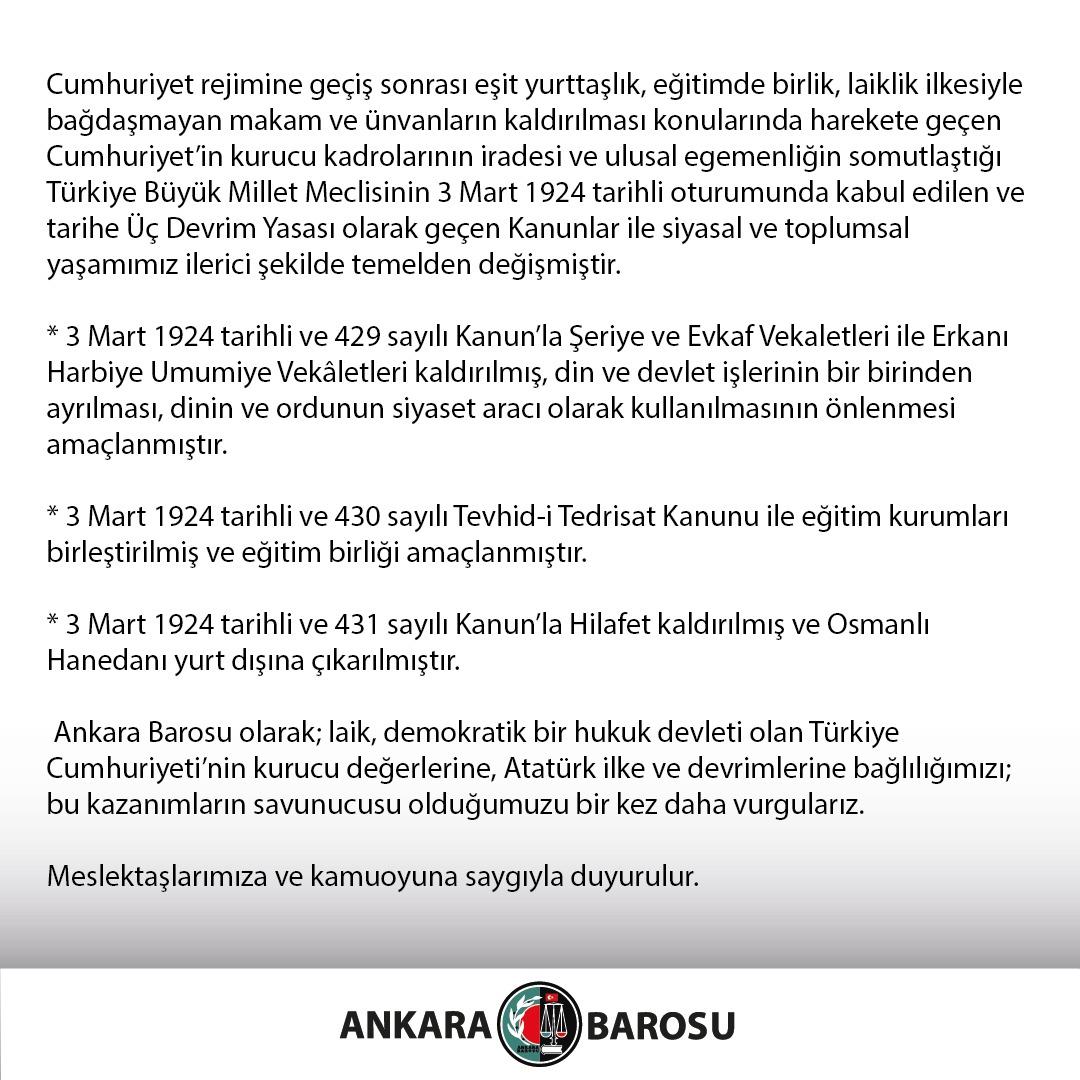 Ankara Barosu olarak; laik, demokratik bir hukuk devleti olan Türkiye Cumhuriyeti'nin kurucu değerlerine, Atatürk ilke ve devrimlerine bağlılığımızı; bu kazanımların savunucusu olduğumuzu bir kez daha vurgularız.