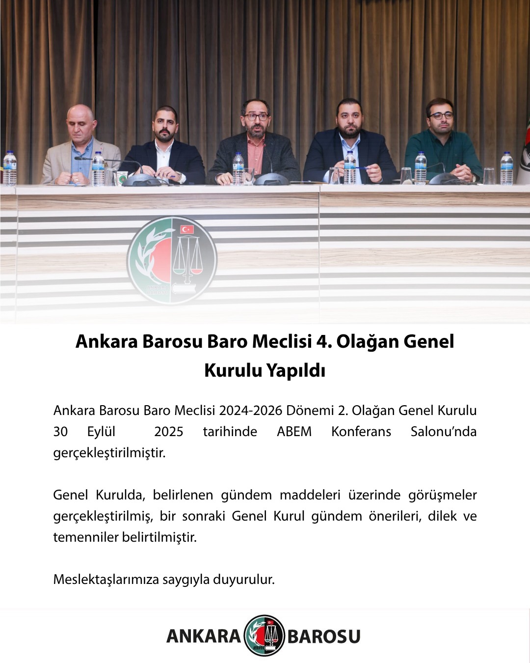 Ankara Barosu Baro Meclisi 2024-2026 Dönemi 4. Olağan Genel Kurulu 30 Eylül 2025 tarihinde ABEM Konferans Salonu’nda gerçekleştirilmiştir.