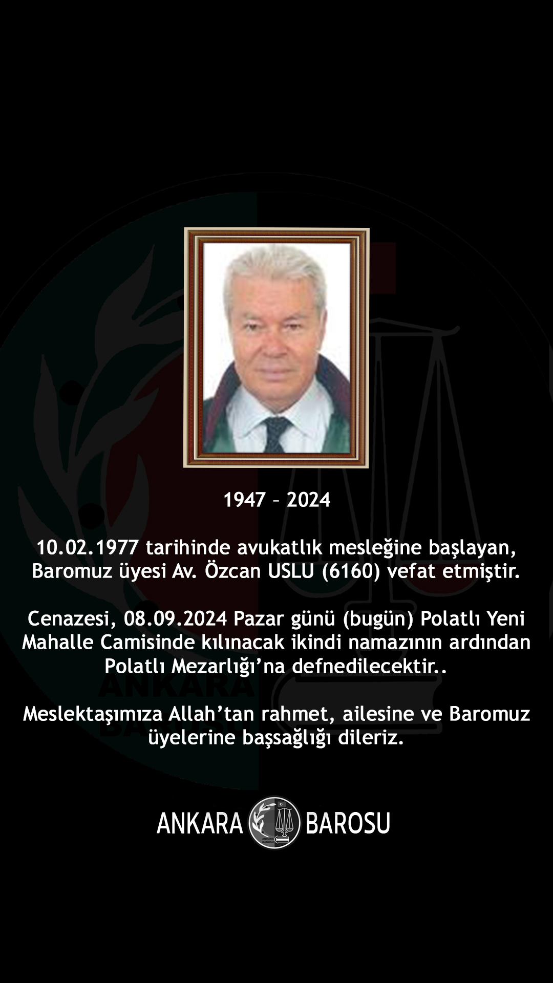 BAROMUZ ÜYESİ AV. ÖZCAN USLU (6160) VEFAT ETMİŞTİR