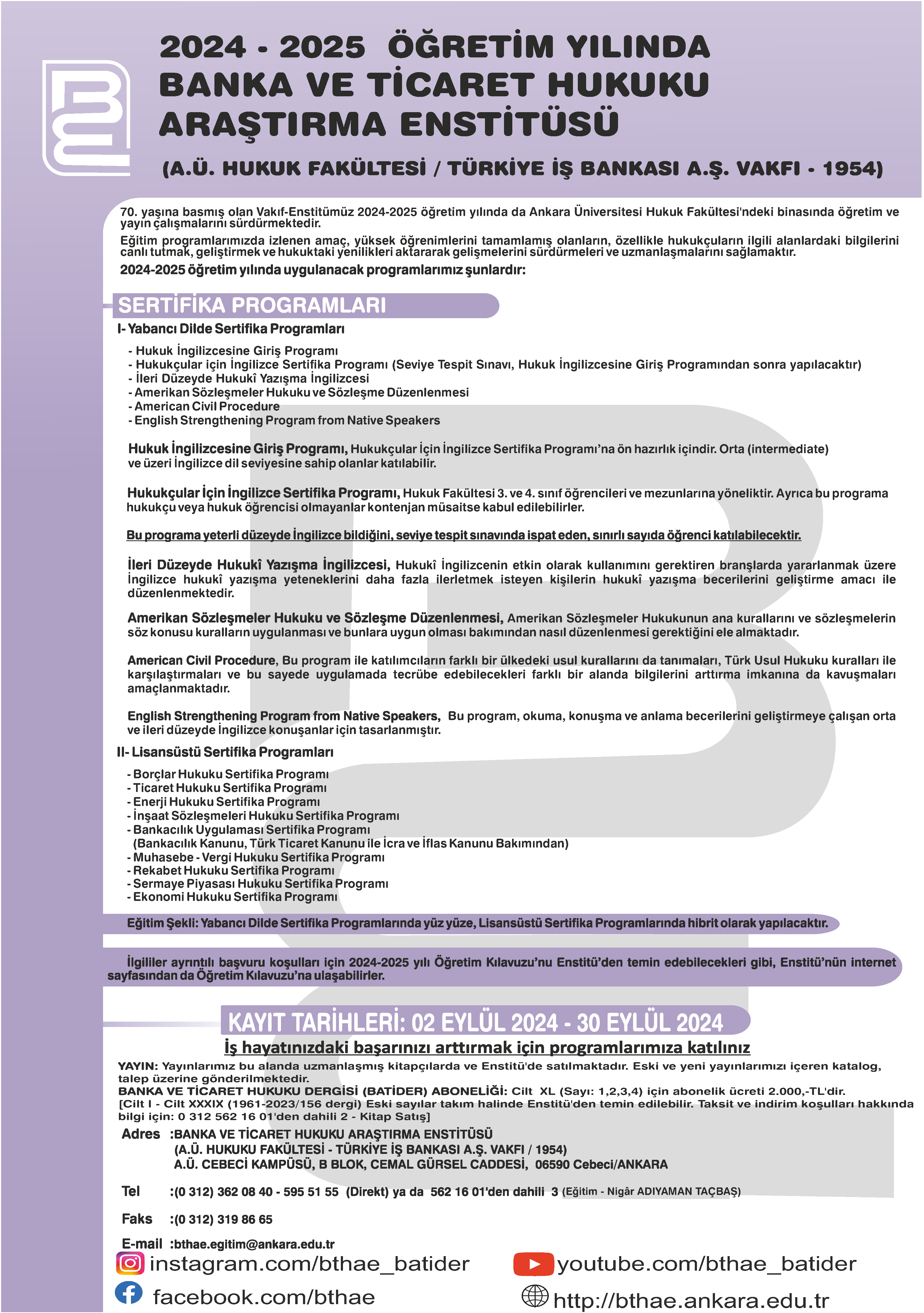 BANKA VE TİCARET HUKUKU ARAŞTIRMA ENSTİTÜSÜ 2024-2025 ÖĞRETİM YILI SERTİFİKA PROGRAMLARI