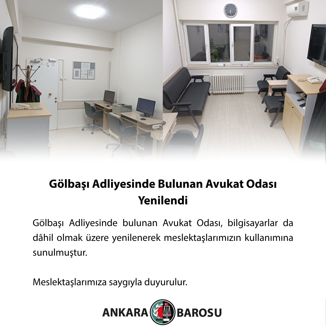 Gölbaşı Adliyesinde bulunan Avukat Odası, bilgisayarlar da dâhil olmak üzere yenilenerek meslektaşlarımızın kullanımına sunulmuştur. Meslektaşlarımıza saygıyla duyurulur.