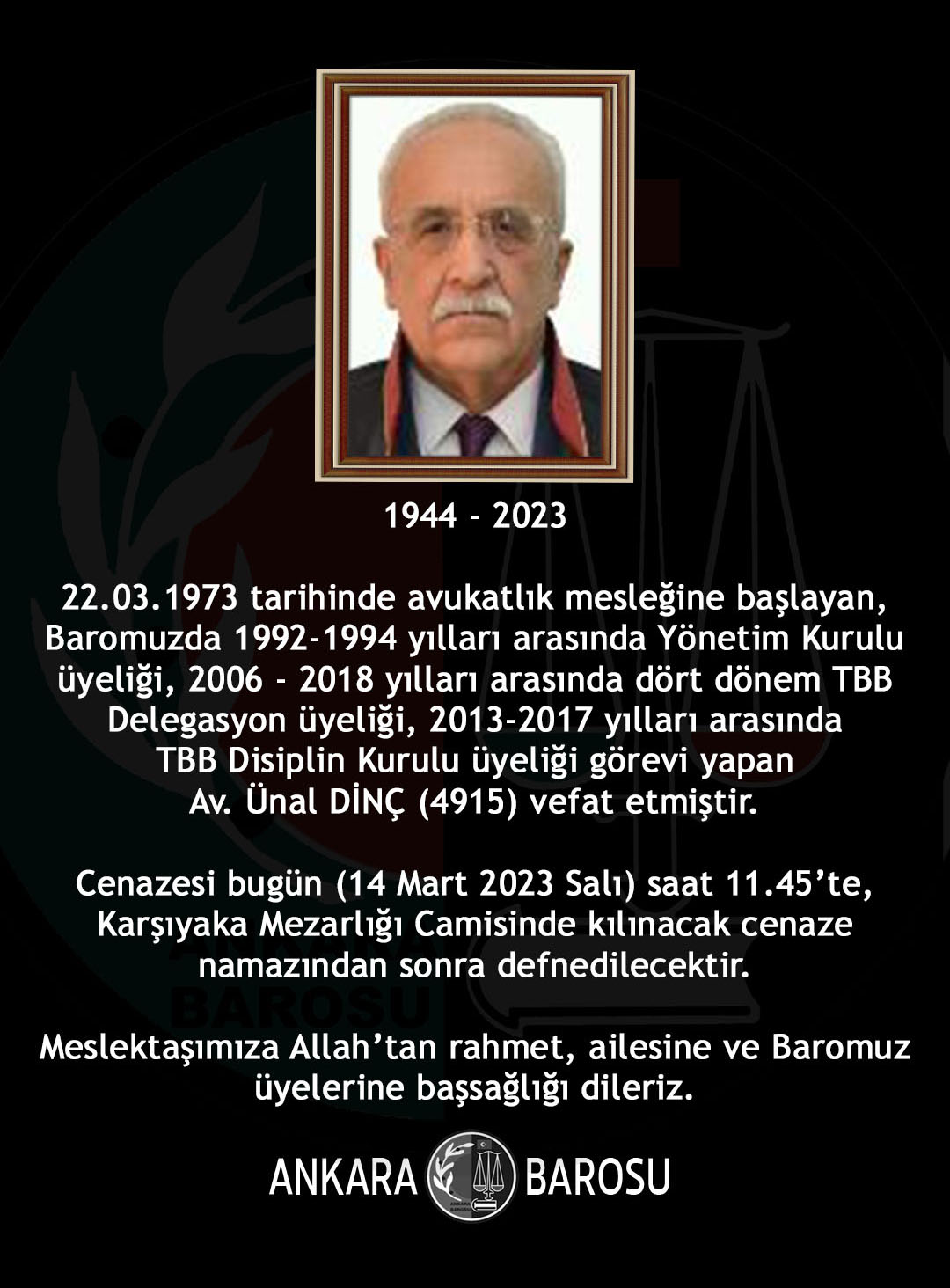 22.03.1973 tarihinde avukatlık mesleğine başlayan, Baromuzda 1992-1994 yılları arasında Yönetim Kurulu üyeliği, 2006 - 2018 yılları arasında dört dönem TBB Delegasyon üyeliği, 2013-2017 yılları arasında TBB Disiplin Kurulu üyeliği görevi yapan Av. Ünal DİNÇ (4915) vefat etmiştir.
