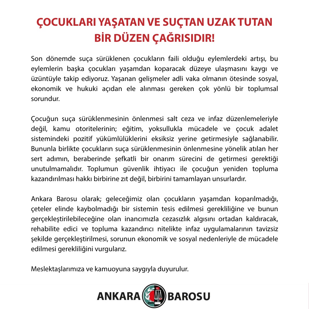 Ankara Barosu olarak; geleceğimiz olan çocukların yaşamdan koparılmadığı, çeteler elinde kaybolmadığı bir sistemin tesis edilmesi gerekliliğine ve bunun gerçekleştirilebileceğine olan inancımızla cezasızlık algısını ortadan kaldıracak, rehabilite edici ve topluma kazandırıcı nitelikte infaz uygulamalarının tavizsiz şekilde gerçekleştirilmesi, sorunun ekonomik ve sosyal nedenleriyle de mücadele edilmesi gerekliliğini vurgularız.
